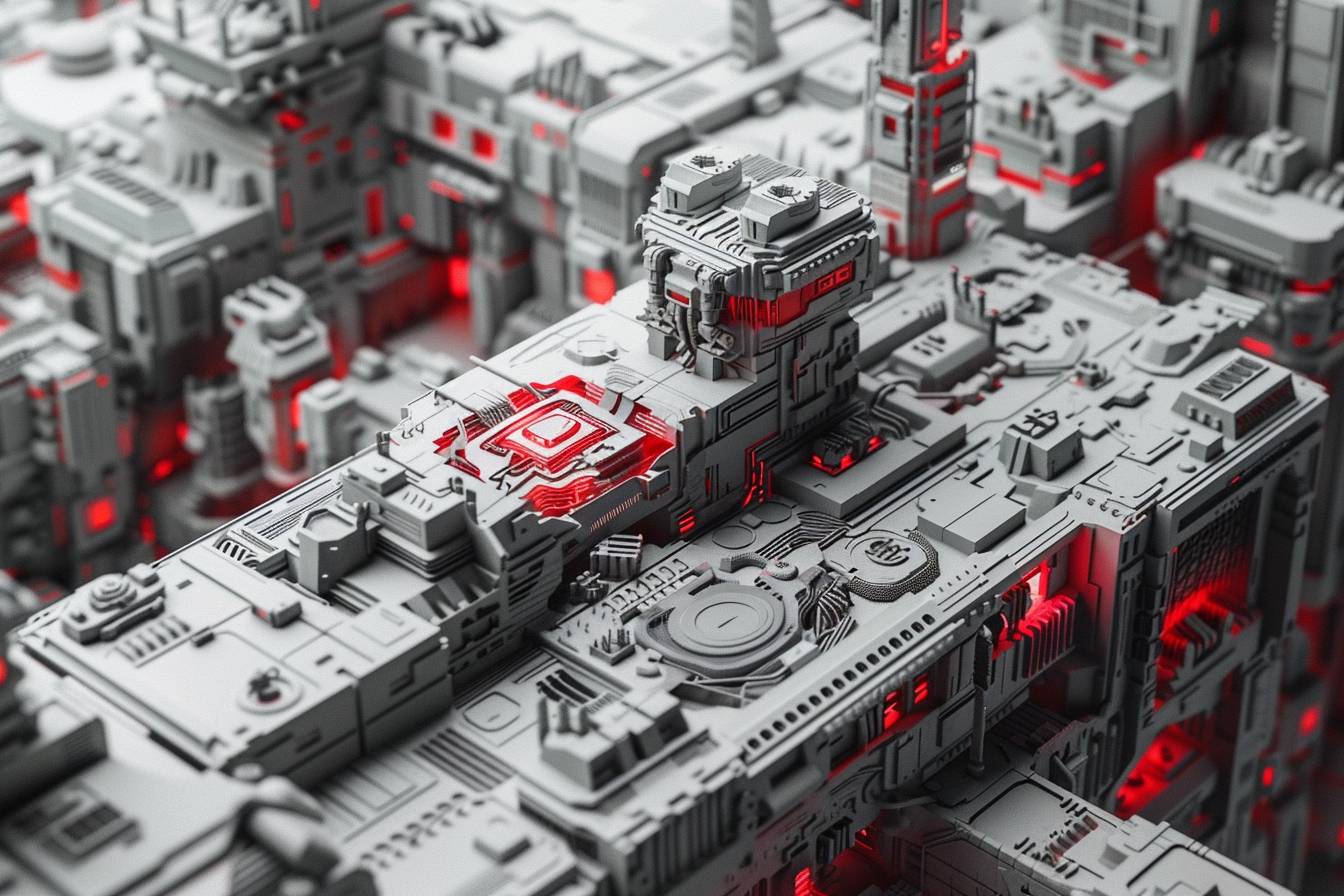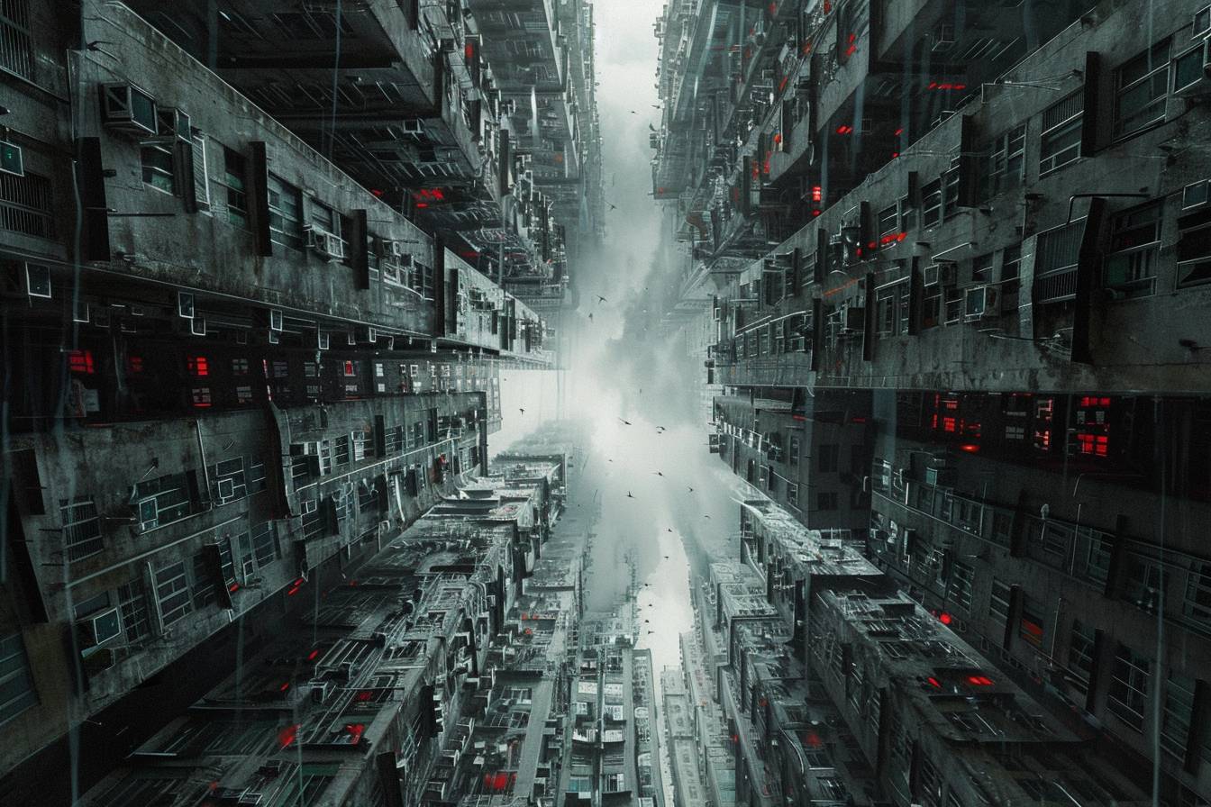 The dystopian rebel, navigating this ash grey labyrinthine city, where each building reflects a rebellion red multitude of realities, challenging the very concept of space and time --ar 3:2 --style raw --v 6.0