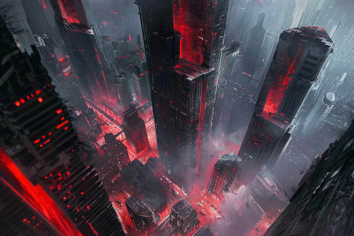 O rebelde distópico, navegando nesta cidade labiríntica cinza-asha, onde cada edifício reflete uma multidão de realidades vermelhas de rebelião, desafiando o próprio conceito de espaço e tempo.