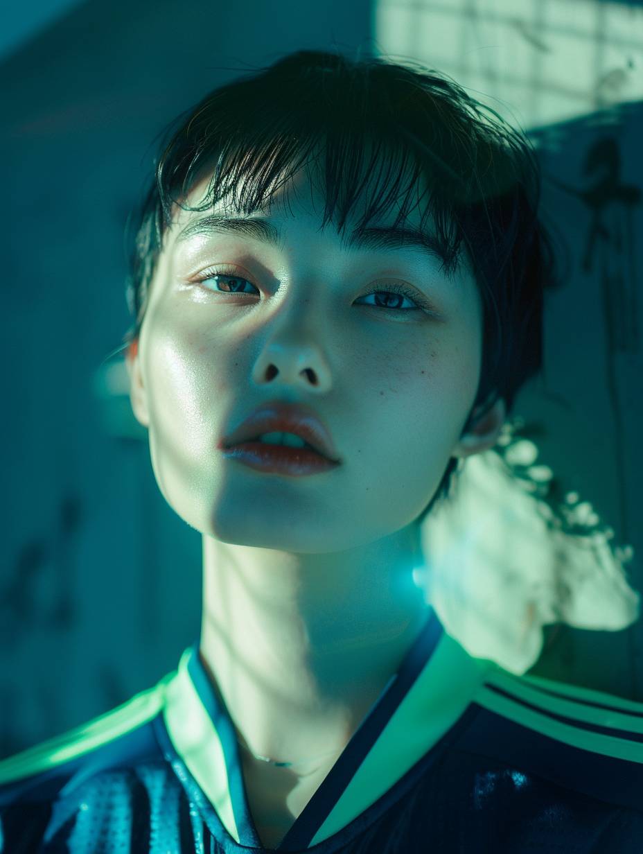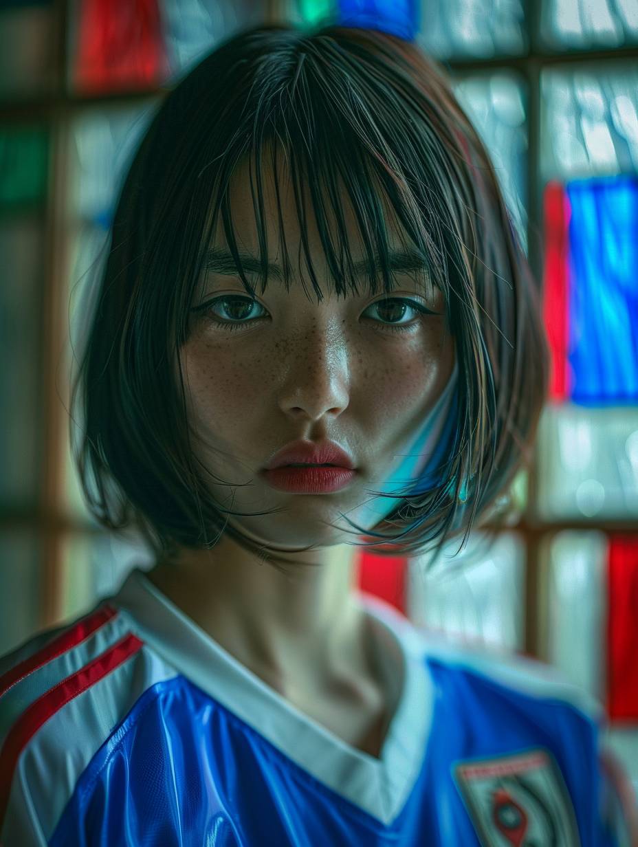 Female soccer fans jersey Astral of young Beautiful japan priest Blue short hair girl with striking Eyes and pouty lips, white skin.interplay of light and shadow.Dramatic composition. Solarium, shotting by fuji xt-5, sharp photography, intricate details --ar 3:4 --v 6.0