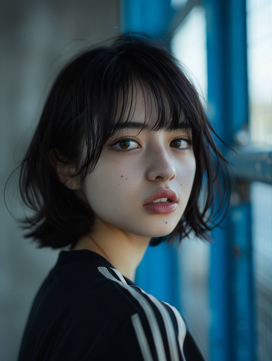 Uma jovem japonesa bonita com cabelo curto azul, olhos marcantes e lábios carnudos, vestindo uma camiseta de fã de futebol feminino. Pele branca. Interação de luz e sombra. Composição dramática. Fotografada em um solário, com a Fuji XT-5, fotografia nítida, detalhes intrincados.