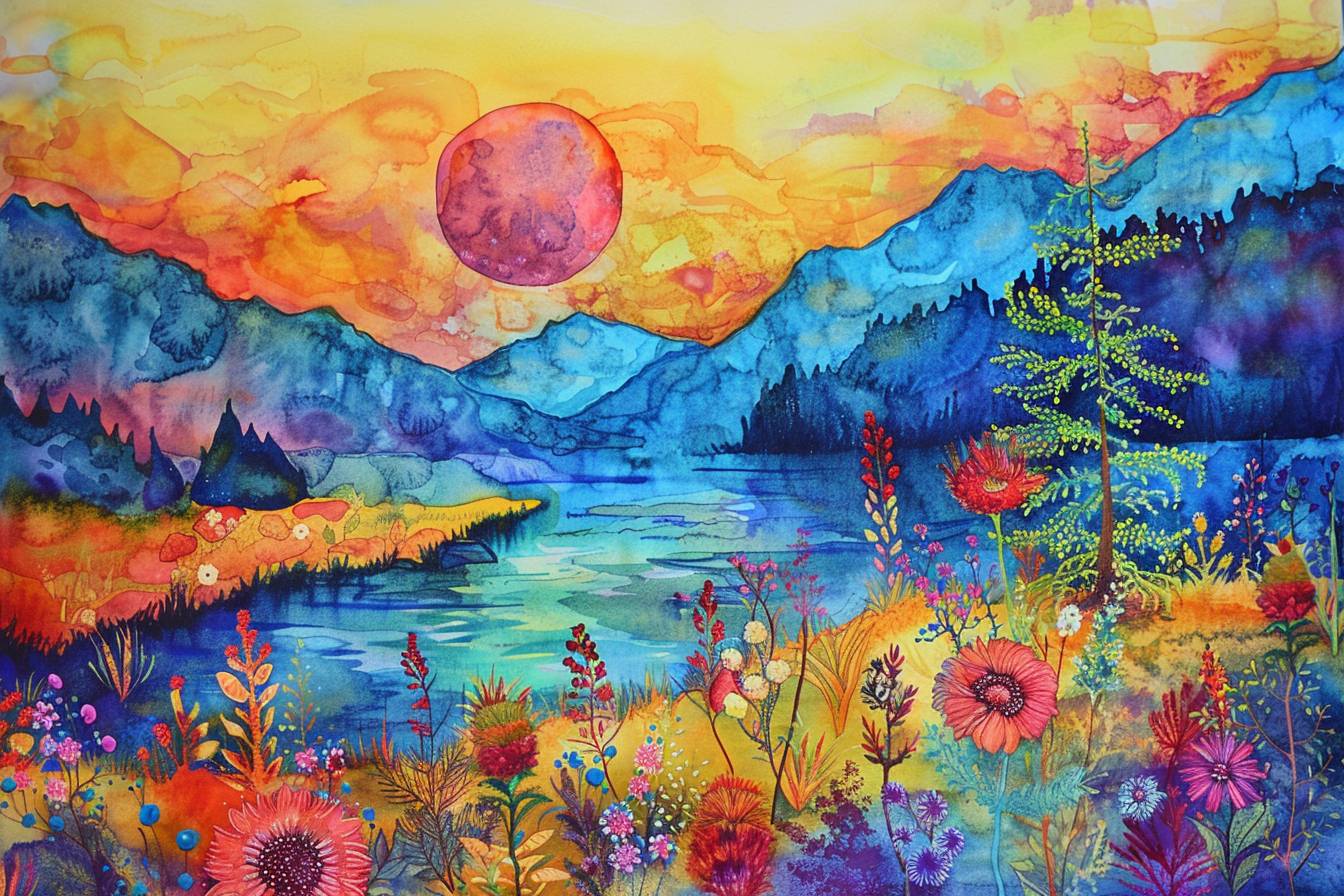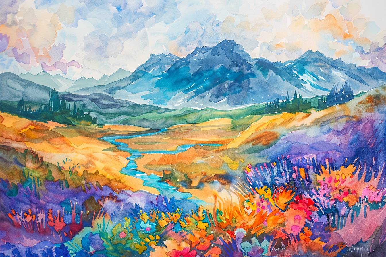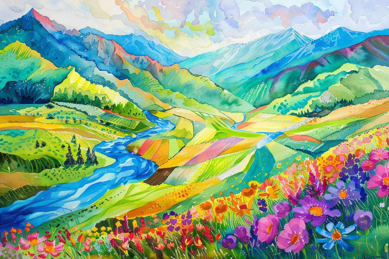 Uma pintura em aquarela colorida mostrando montanhas, rios, flores e campos.