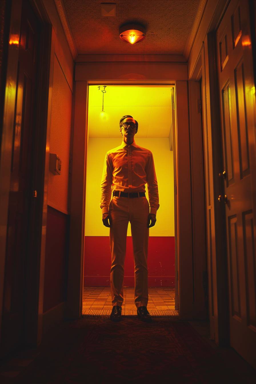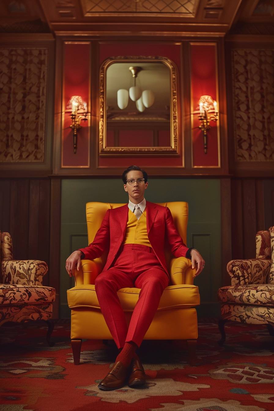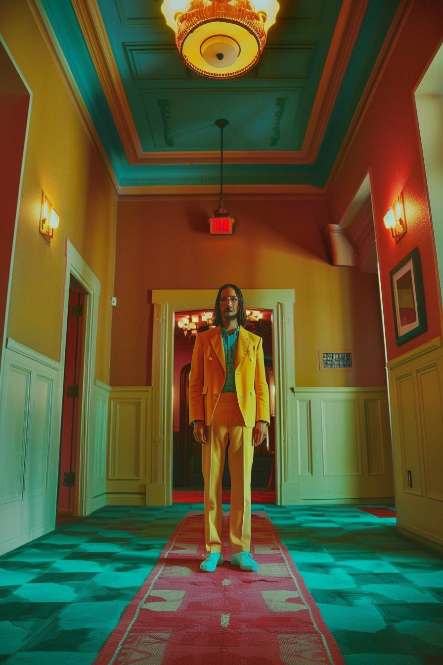 Estilo de Wes Anderson, composição simétrica, foto de corpo inteiro, iluminação dramática, still de filme, cores vibrantes, fotografia ultra-realista.