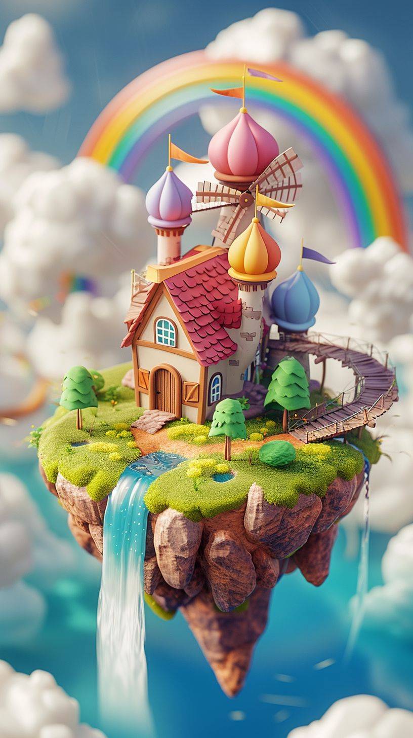 A 3D isometric view of a floating island with whimsical windmills, fluffy clouds, and rainbow bridges, in the style of texture-rich landscapes, cute cartoonish designs, clean and streamlined, subtle gradients, grid-based, captivating, isolate on white --ar 9:16 --v 6