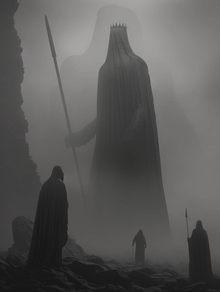 Cena épica, a arte apresenta uma figura assombrosa, uma mulher com uma coroa e uma lança, parcialmente envolta em escuridão. Os tons em escala de cinza e o fundo nebuloso criam uma cena misteriosa e arrepiante, gótica, fantasia sombria, de Zdzisław Beksiński e Joel-Peter Witkin, pôster de filme, extremamente detalhado, hiperresolução, iluminação volumétrica cinematográfica.