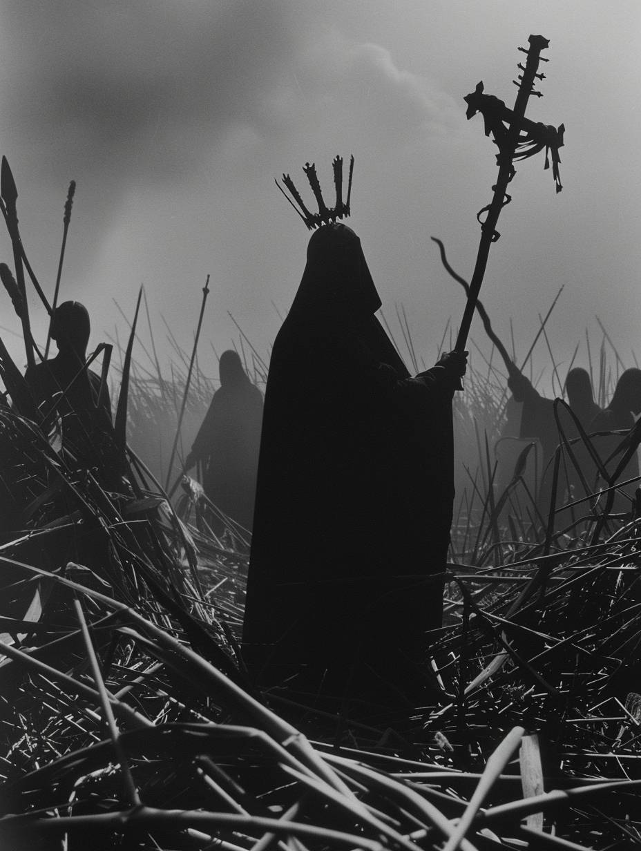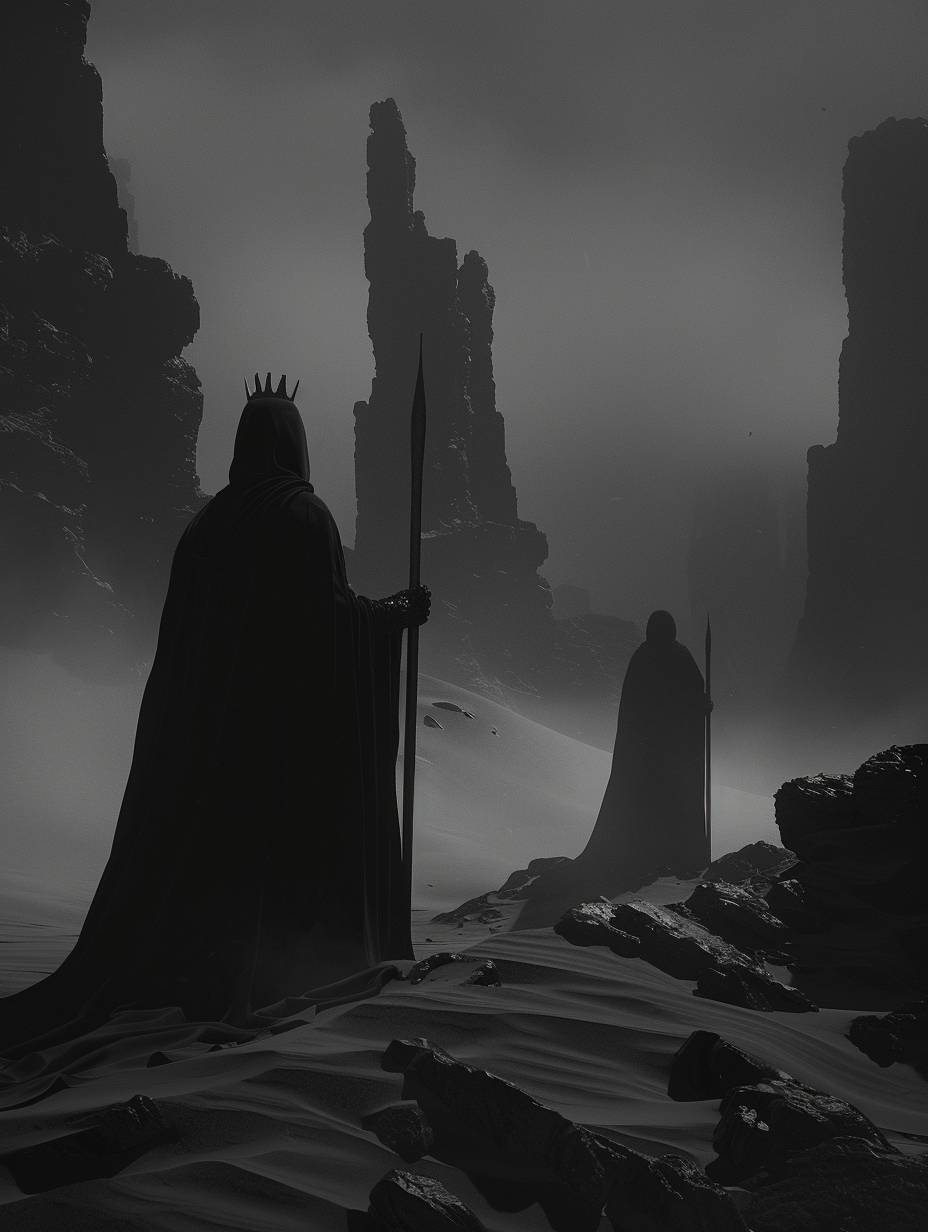 Epic scene, art presents a haunting figure, a woman with a crown and a spear, partially shrouded in darkness. The grayscale tones and the foggy background create a mysterious and eerie scene, Gothic, Dark Fantasy, by Zdzisław Beksiński and Joel-Peter Witkin, movie poster, extremely detailed, hyper resolution, cinematic volumetric lighting, --chaos 20 --ar 3:4 --style raw --personalize rbn1ev7 --stylize 400 --v 6.0