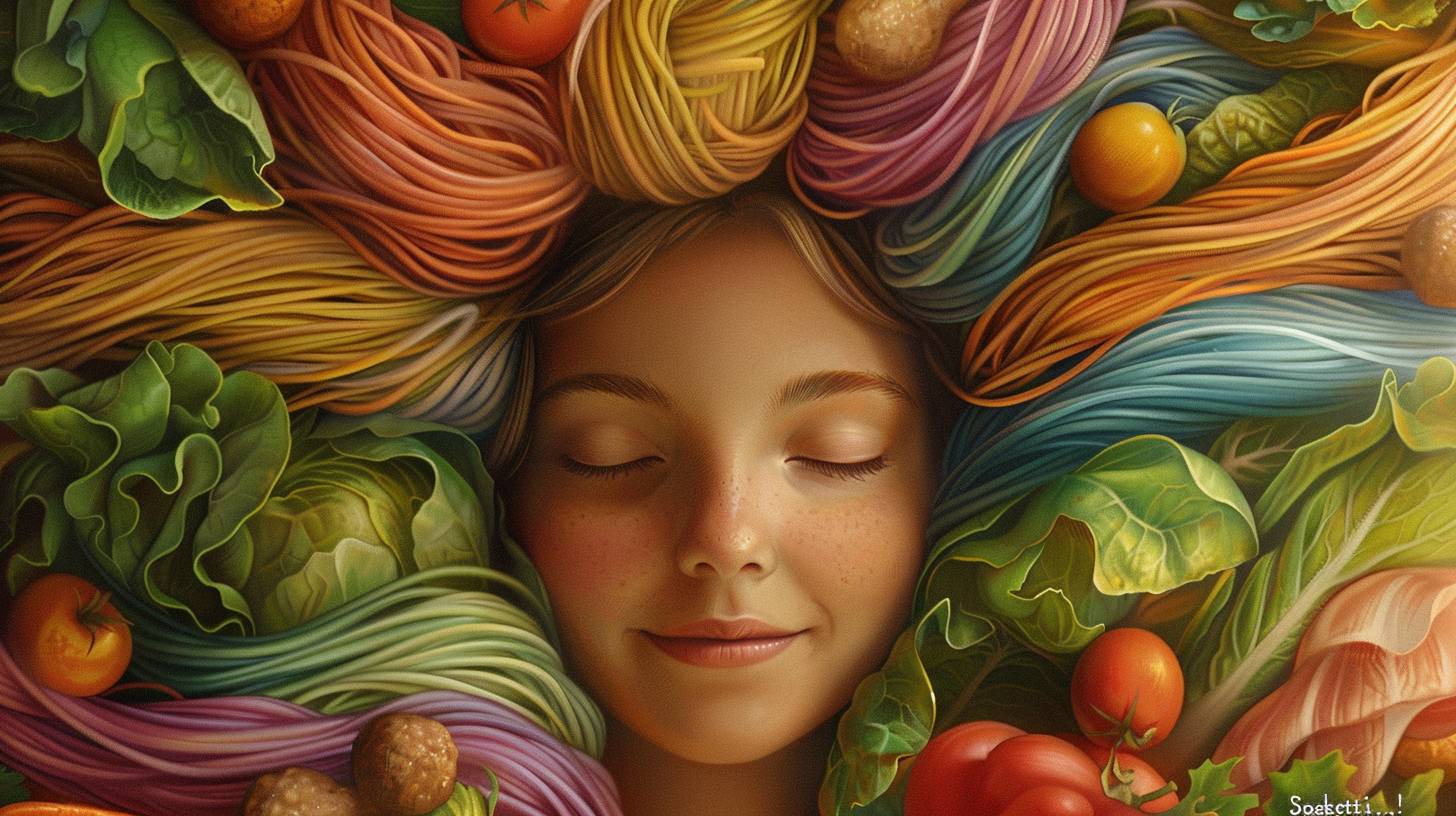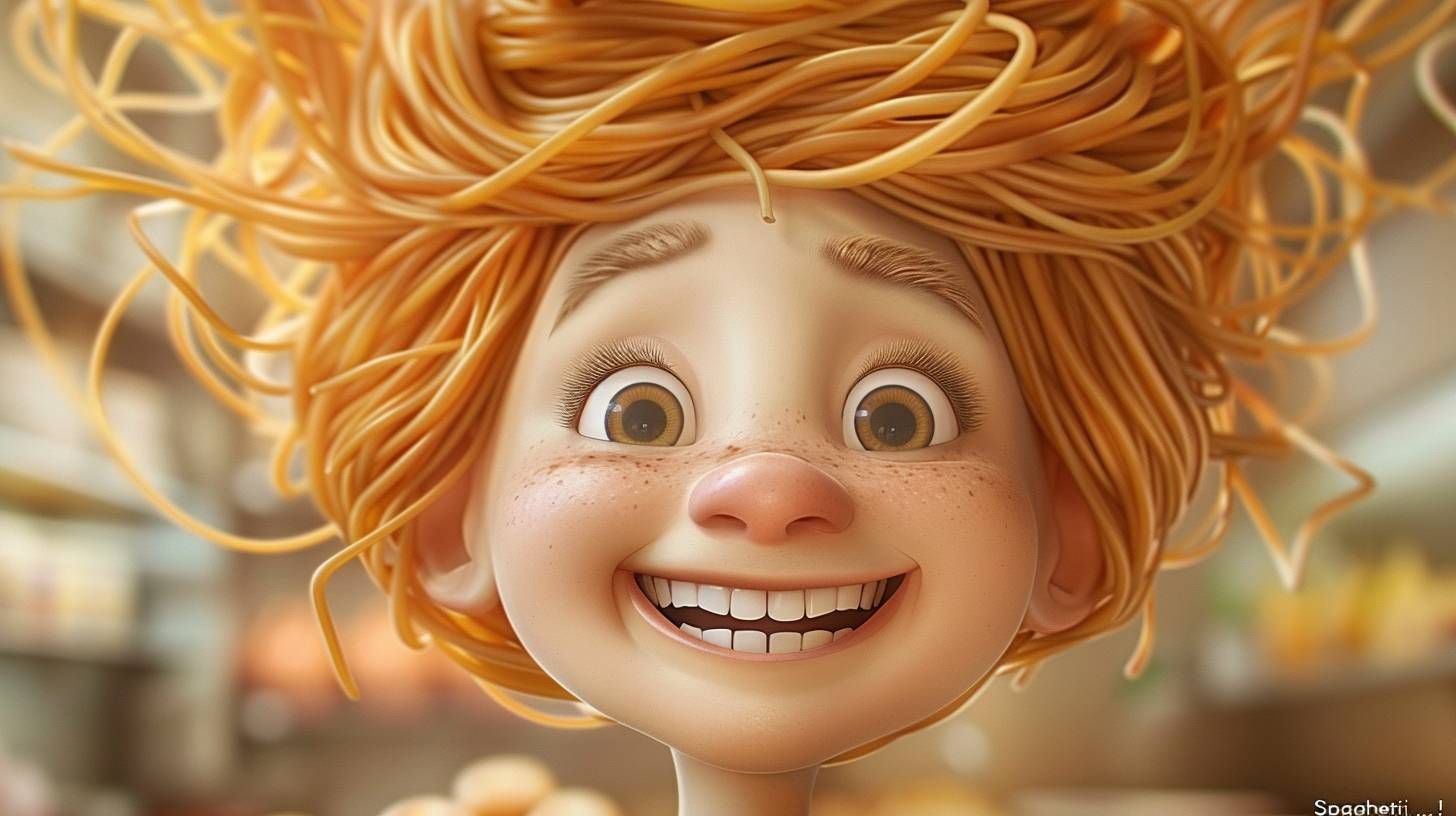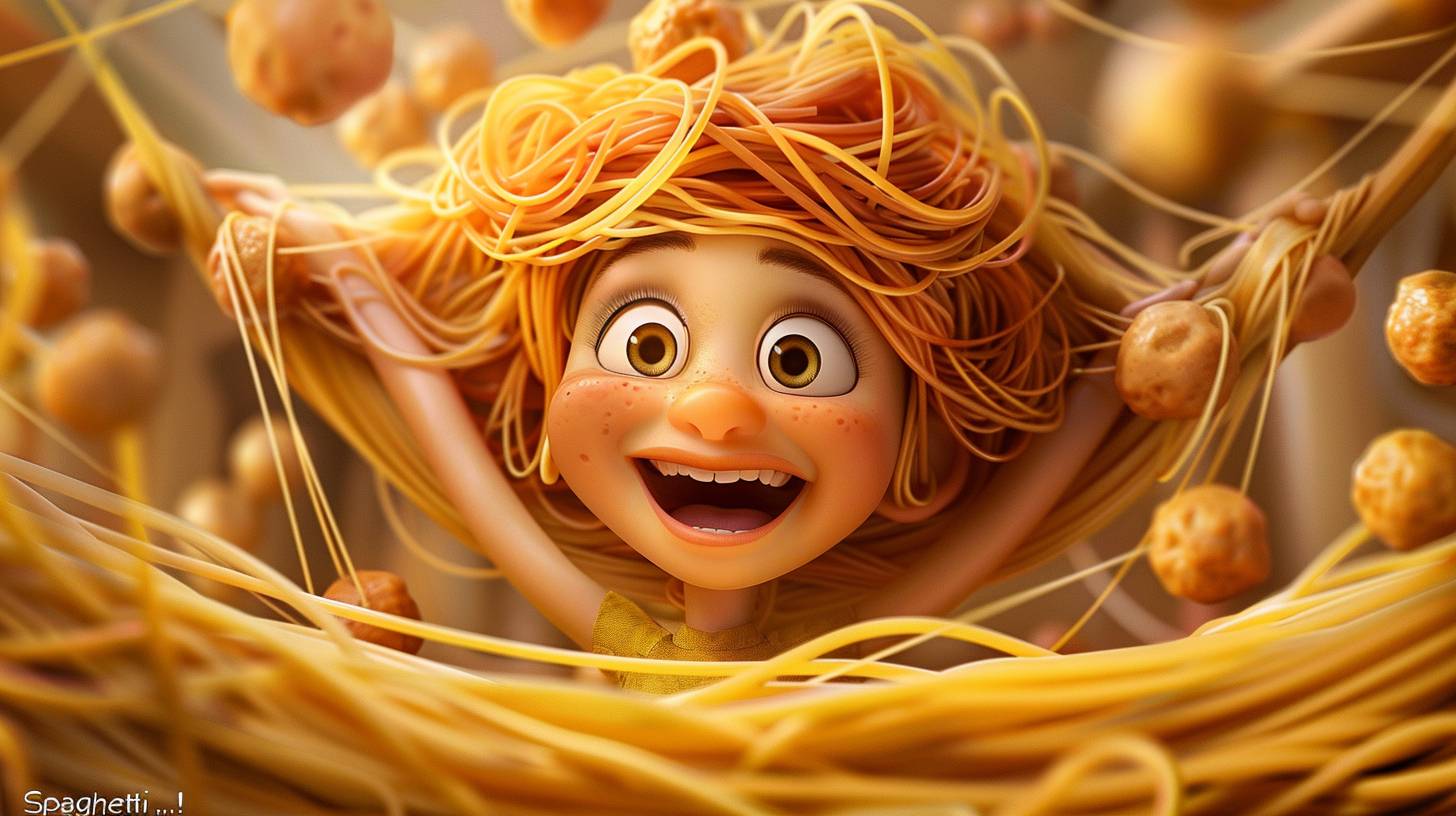 Vector Art. Closeup View. Happy woman smiles big. Her hair is composed of spaghetti-and-large meatballs. She says "Spaghetti...!", Spaghetti and large meatballs everywhere. Gourmet, --ar 16:9 --v 6.0 --s 500 --p 5tnbgrs