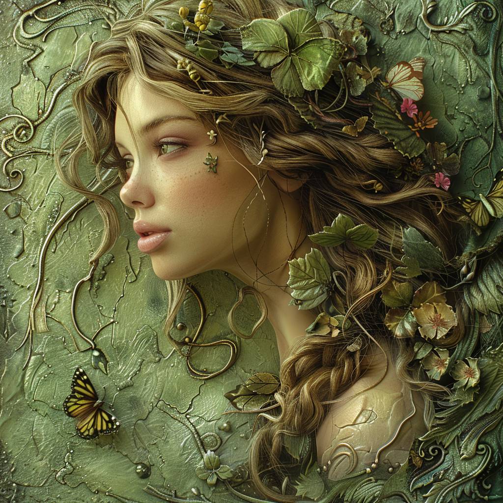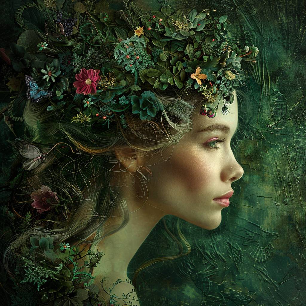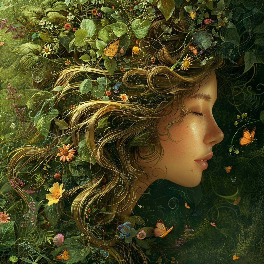 Forest Elegance: Design a stylized portrait of a woman with a serene expression, her hair flowing like a lush forest canopy interwoven with vibrant wildflowers and delicate butterflies. The background is a blend of deep forest greens and soft, elegant hues, symbolizing her grace and connection to nature. Style=Nature-Elegance Fusion --style raw --stylize 300 --v 6.0