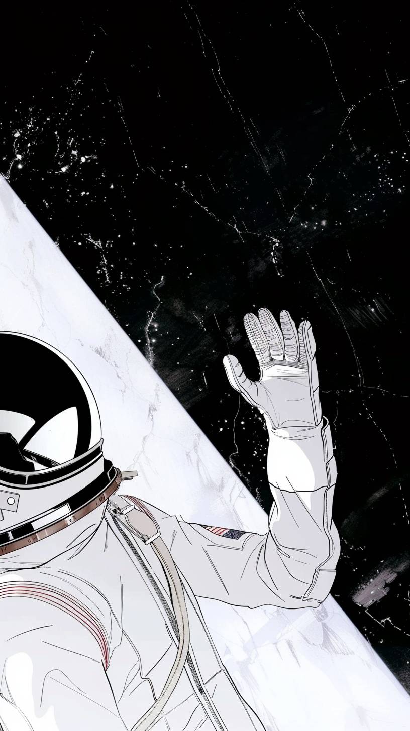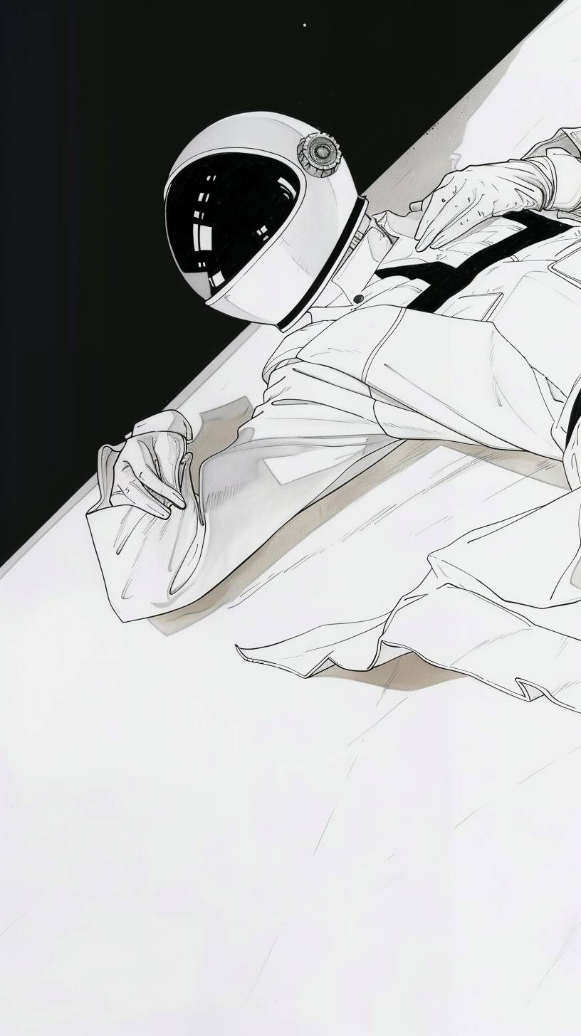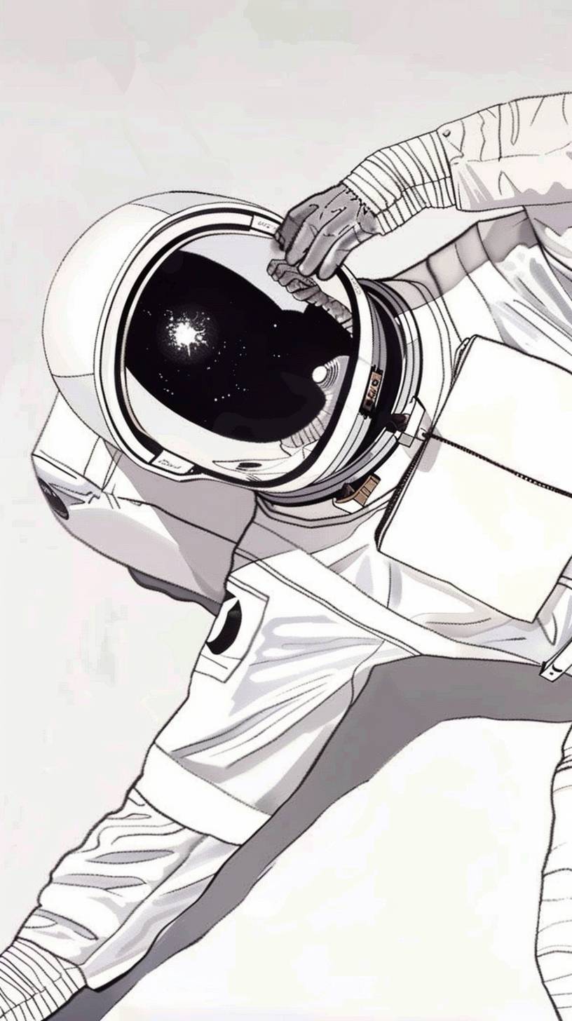 aerial view of astronaut's reflecting helmet, laying on floor looking at ceiling, arm reaching for ceiling --ar 9:16 --sref 76 --v 6.0