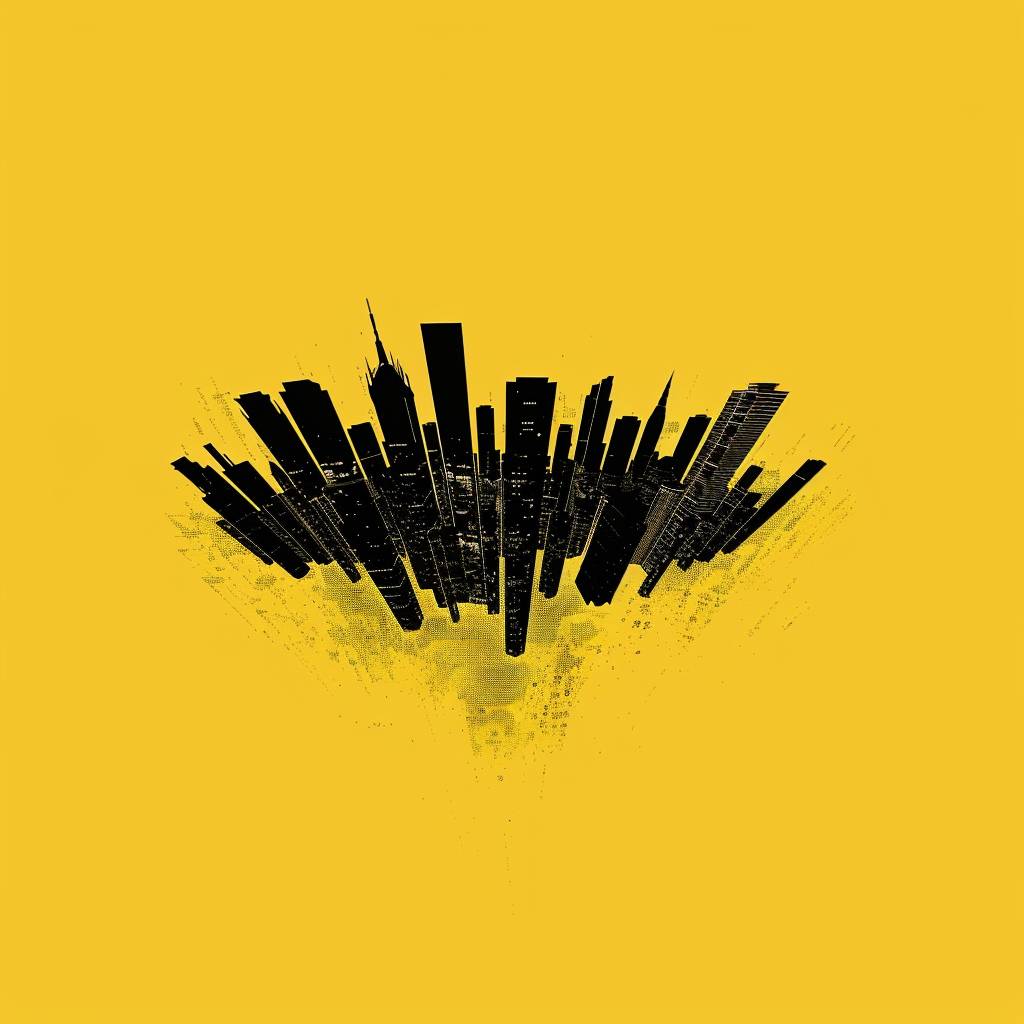 Crie uma imagem minimalista usando um fundo amarelo com cores pretas para retratar uma cena icônica do filme 'Inception'. A cena mostra uma paisagem urbana se curvando sobre si mesma, representada por silhuetas pretas de arranha-céus curvando-se em direção um ao outro em um fundo amarelo, capturando a qualidade surreal e onírica do filme.