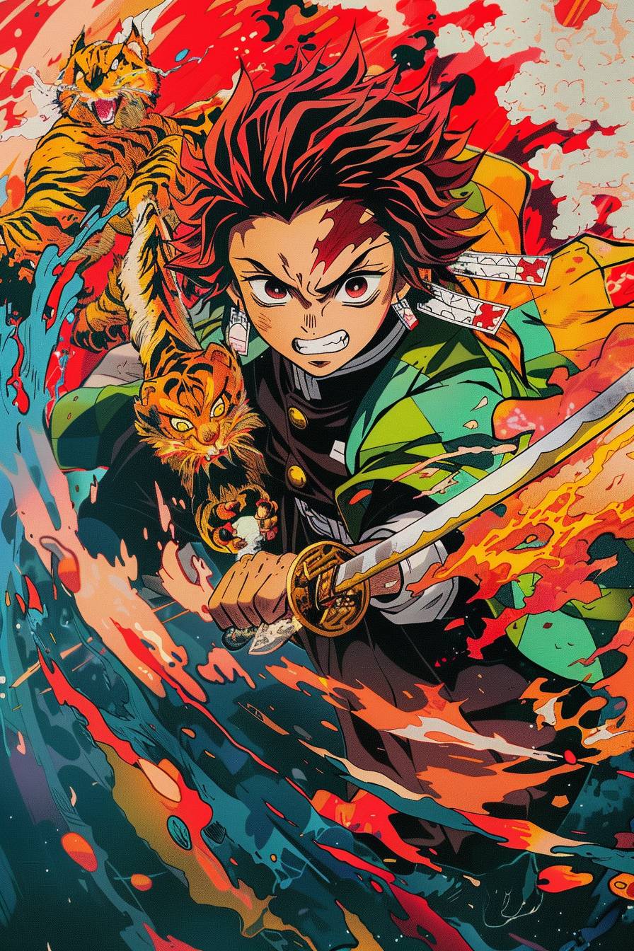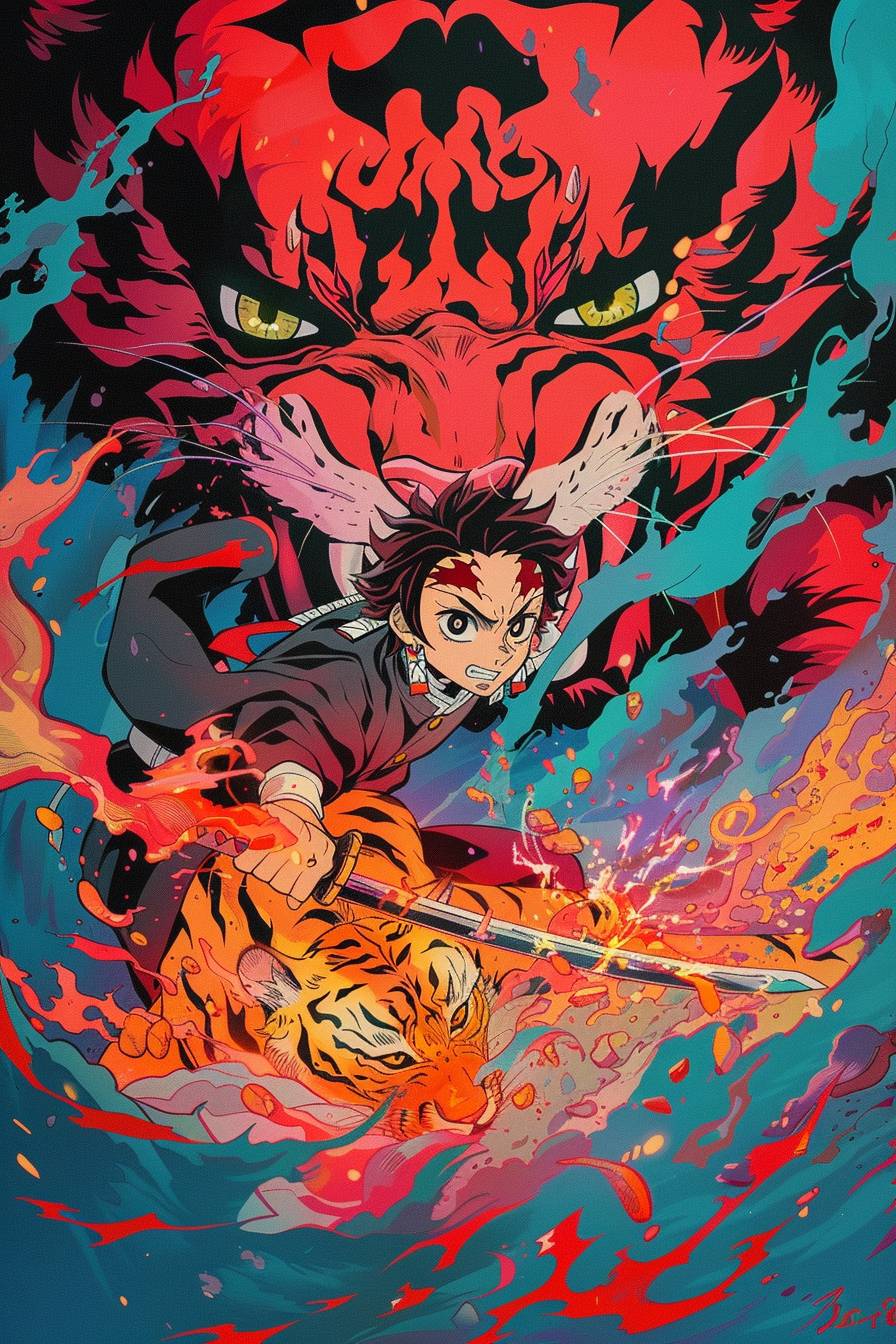 An extremely colorful and vibrant manga panel of the anime demon slayer, in which Zenitsu Agatsuma is fighting with his tiger spirit animal and holding a fire sword against an oncoming red monster demon. In the background, there is also Giyu Tomioka sitting next to him. The colors are bright and saturated, creating an intense atmosphere. It captures the style in the style of Katsuhiro Otomo. --ar 2:3 --v 6.0