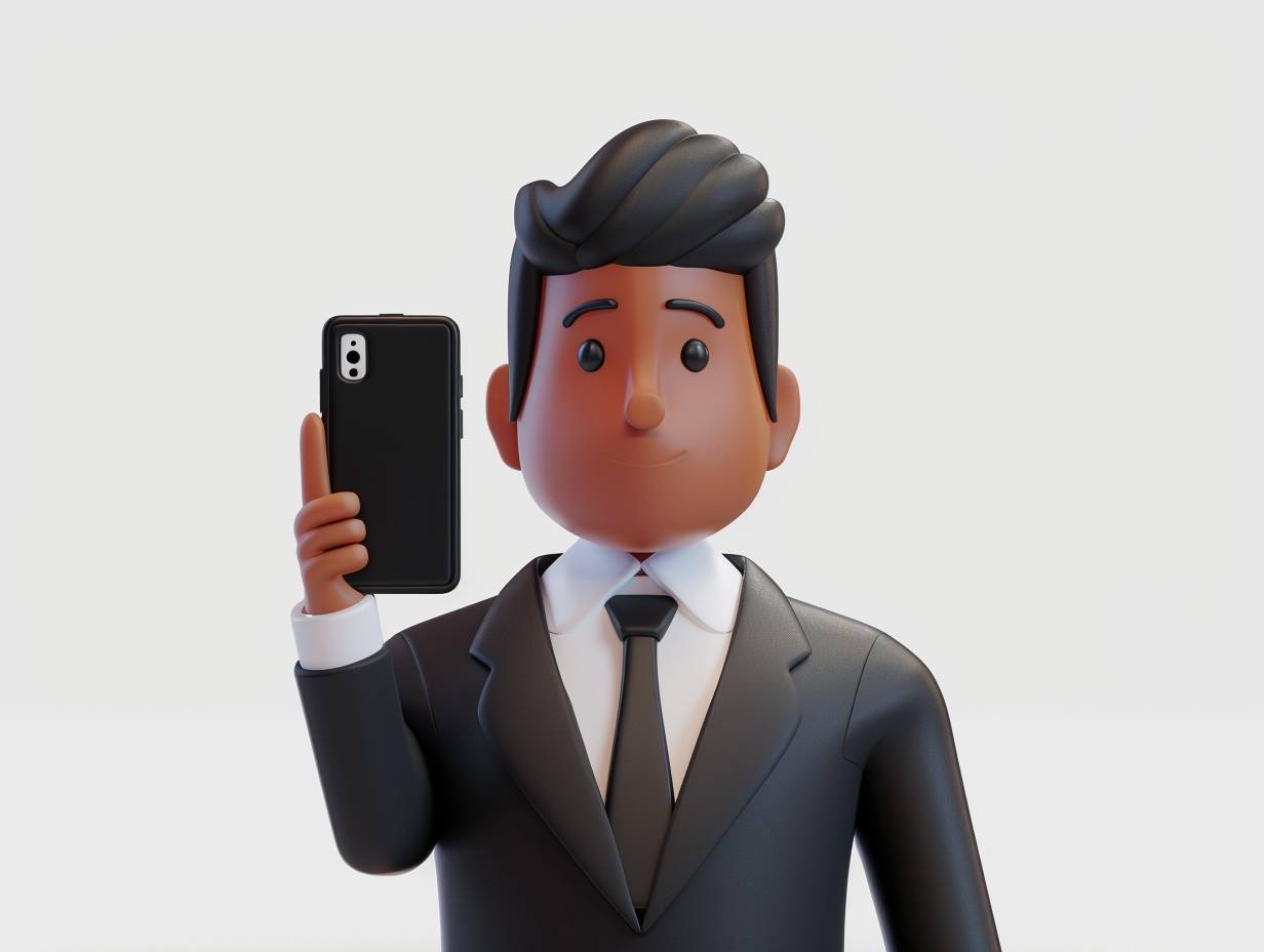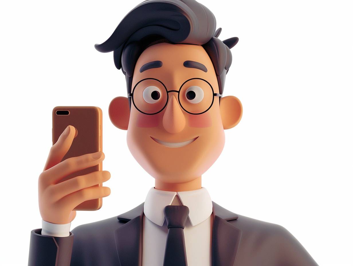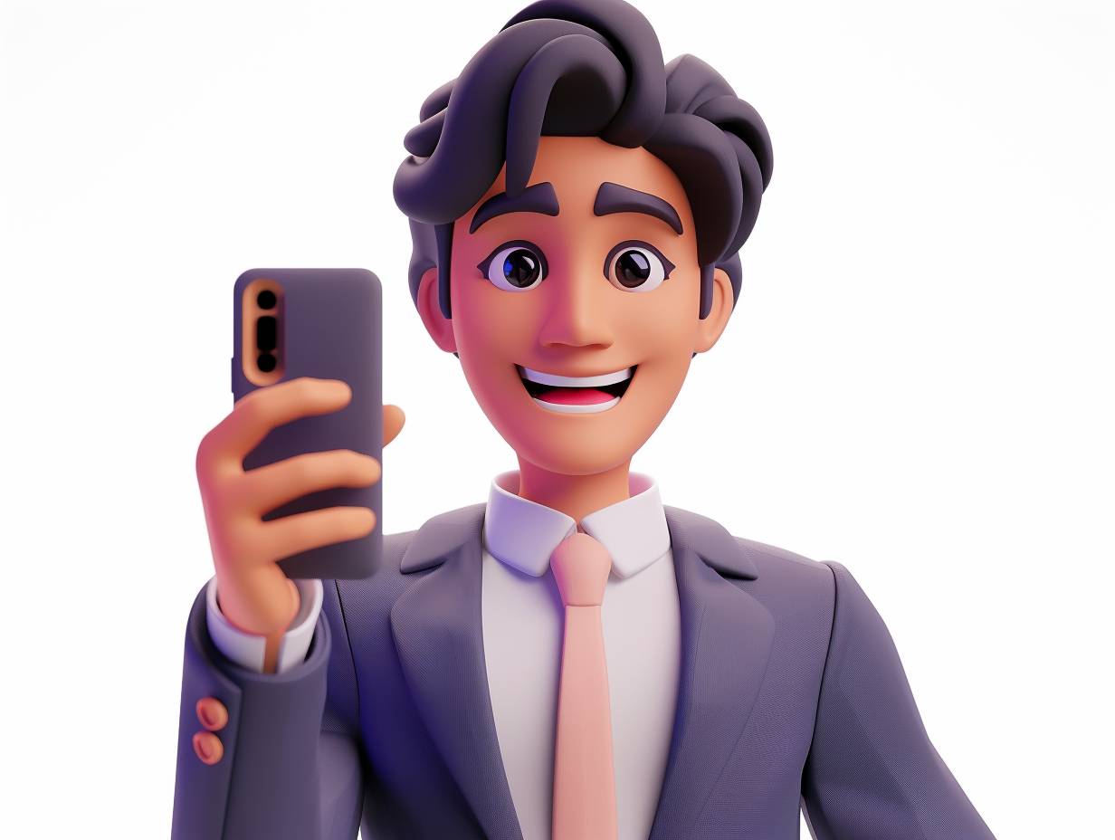 Um ícone 3D de um homem tirando uma selfie com seu celular. A cor do cabelo dele é preta, ele está vestindo um terno, iluminação suave, formas suaves e arredondadas, sem detalhes finos, fundo branco.