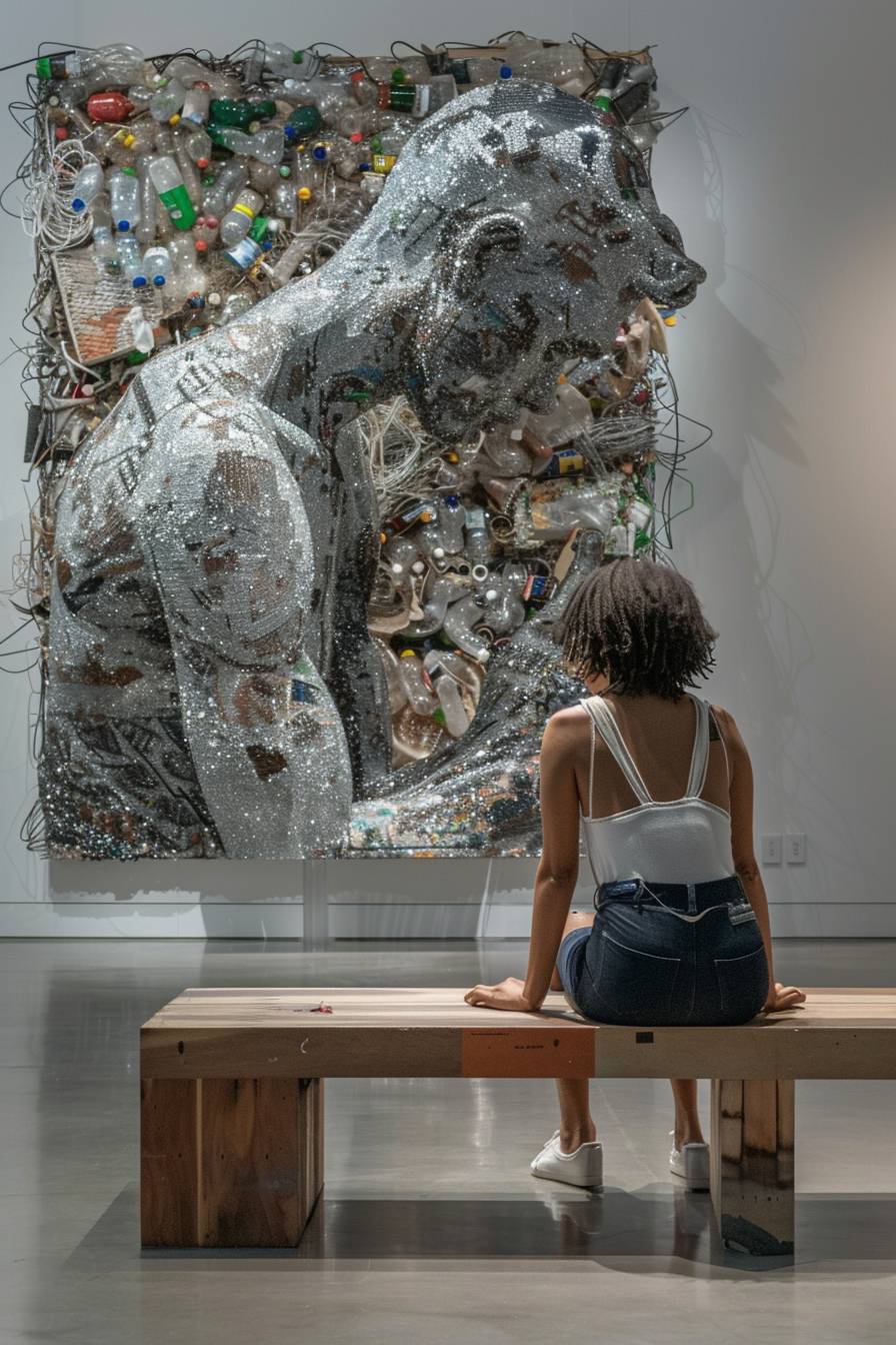 A woman sits on a minimalist wooden bench in an art gallery, deeply engaged in contemplating a massive sculpture resembling a man seated in deep thought, is constructed entirely from a chaotic assortment of discarded materials, such as plastic bottles, wires, and other debris, giving it a striking and unconventional appearance. On the wall next to her, there is a large, framed collage of similarly mixed materials, creating a vibrant and textured artwork. The scene captures the intersection of art and environmental commentary, highlighting themes of waste and creativity. --ar 2:3 --v 6.0