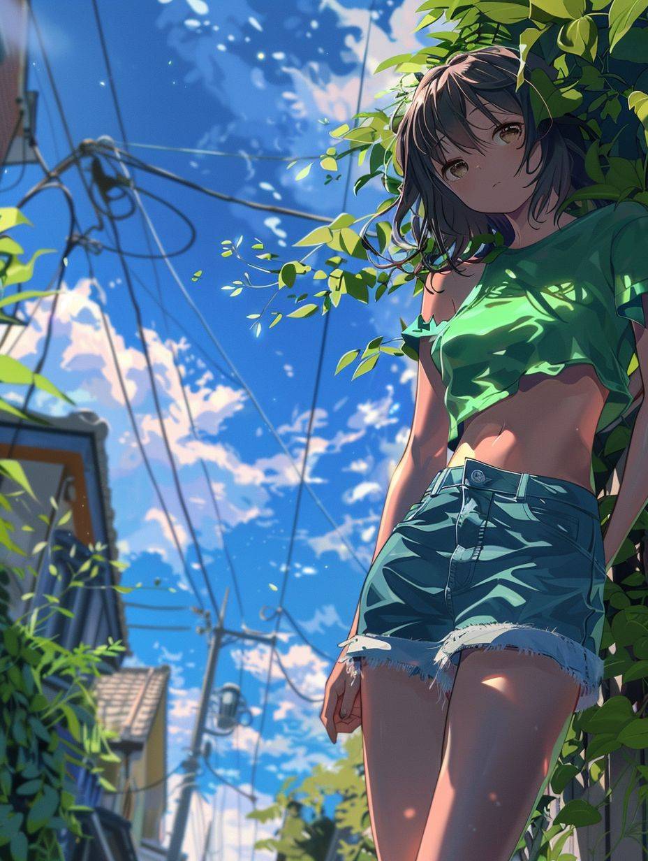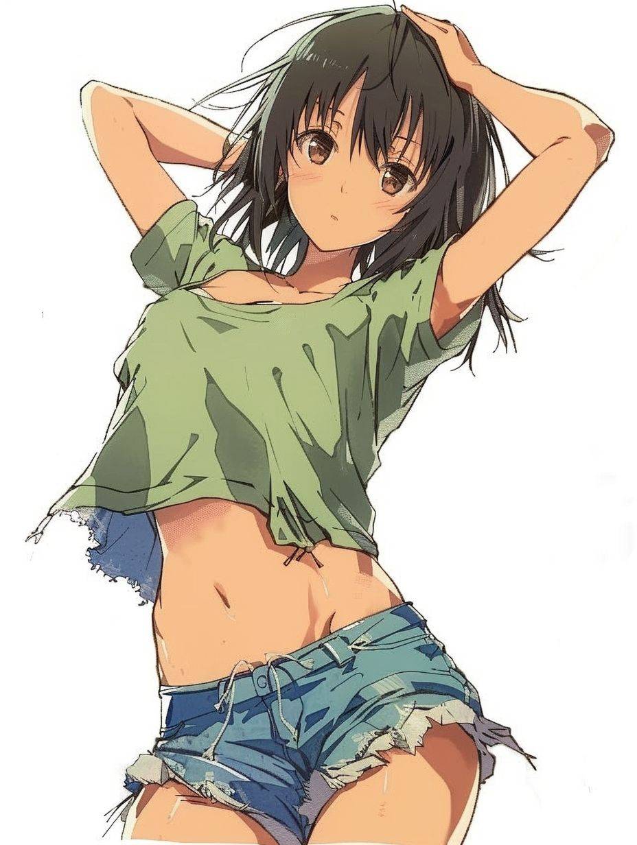 anime girl in green shirt and blue shorts posing for picture, by Kose Kanaoka, anime visual of a cute girl, beautiful anime high school girl, anime best girl, female anime character, attractive anime girl, (anime girl), an anime girl, hinata hyuga, young anime girl, by Ikuo Hirayama, anime girl --ar 3:4