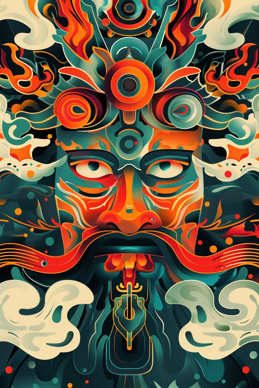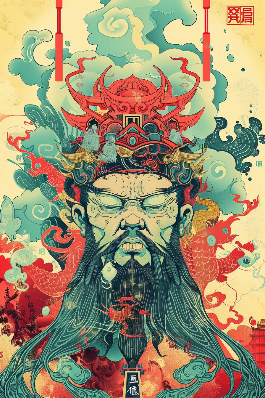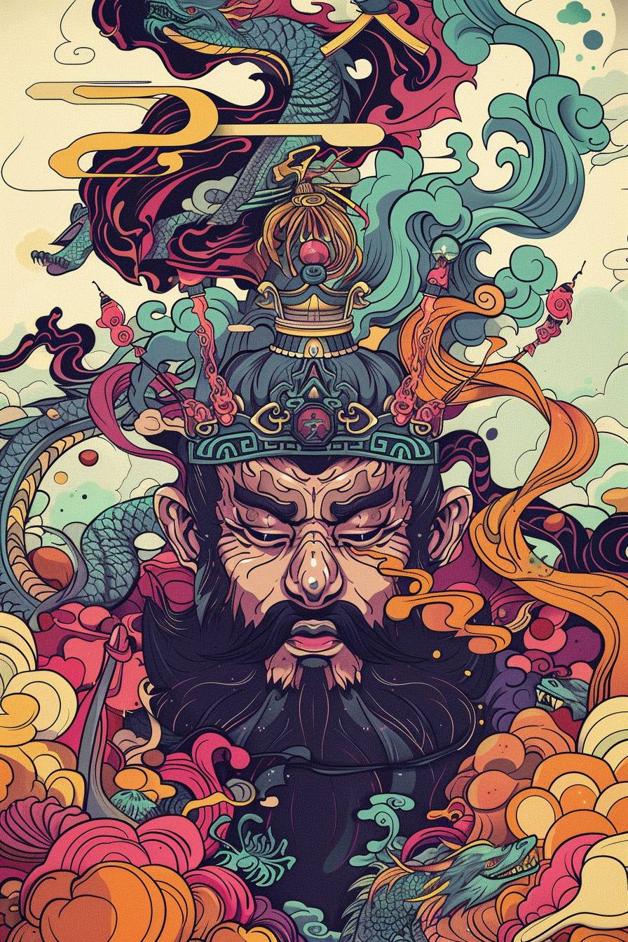 a [SUBJECT] illustration, in the style of bold lines, dynamic colors, chinese iconography, limited shading, cartoonish --ar 2:3 --v 6.0