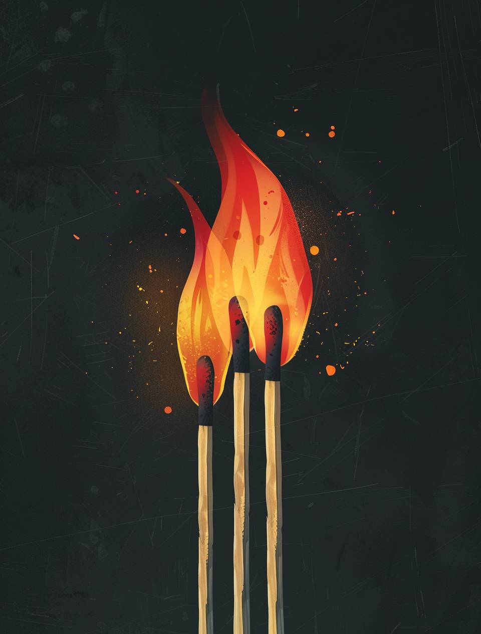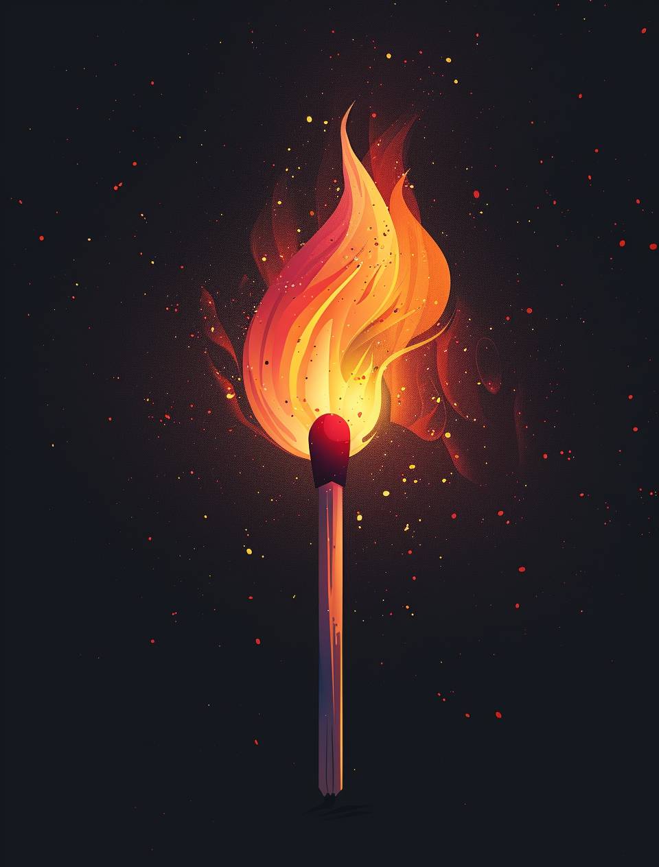 A simple flat illustration of fire match, black background, minimalist style with bright colors and a sense of space,8k resolution , best quality , full body shot --ar 16:21 --style raw --stylize 250 --v 6.0