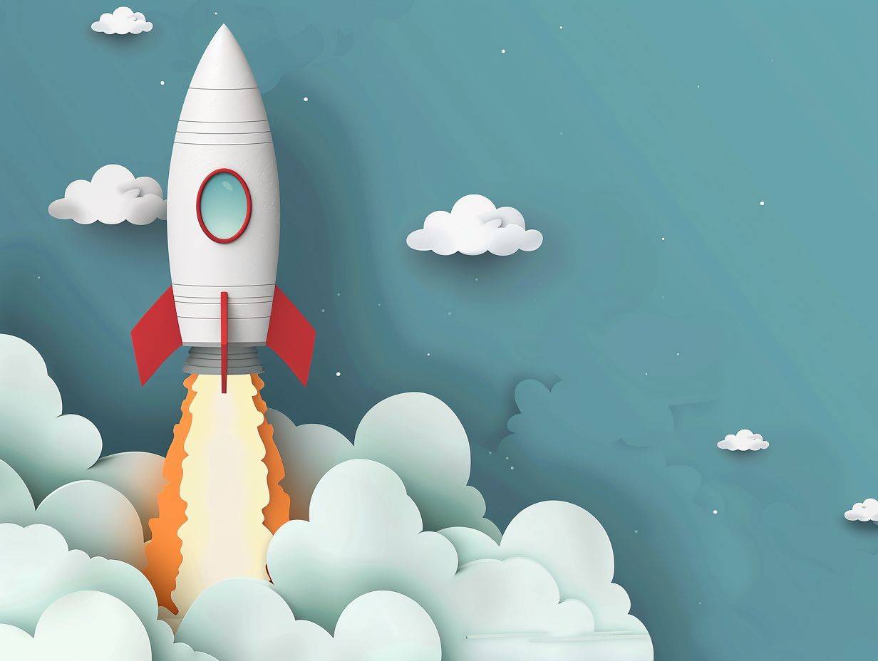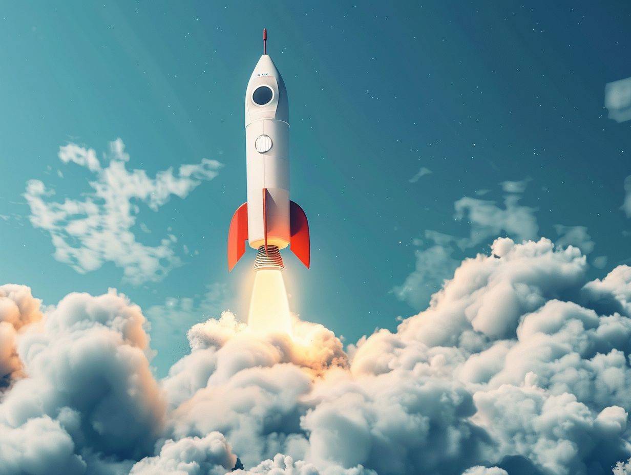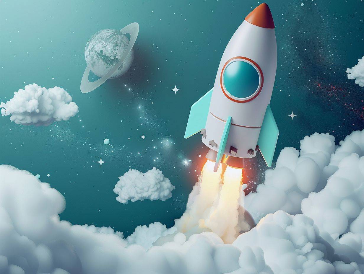 Cenário onírico de lançamento de foguetes, nuvens fofas, espaço para texto.