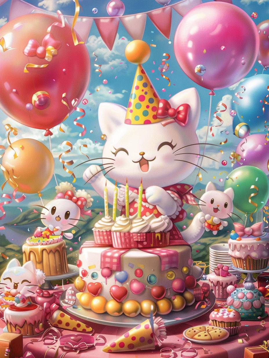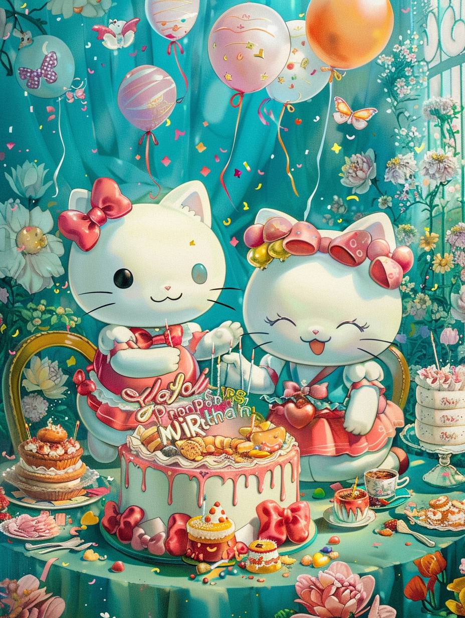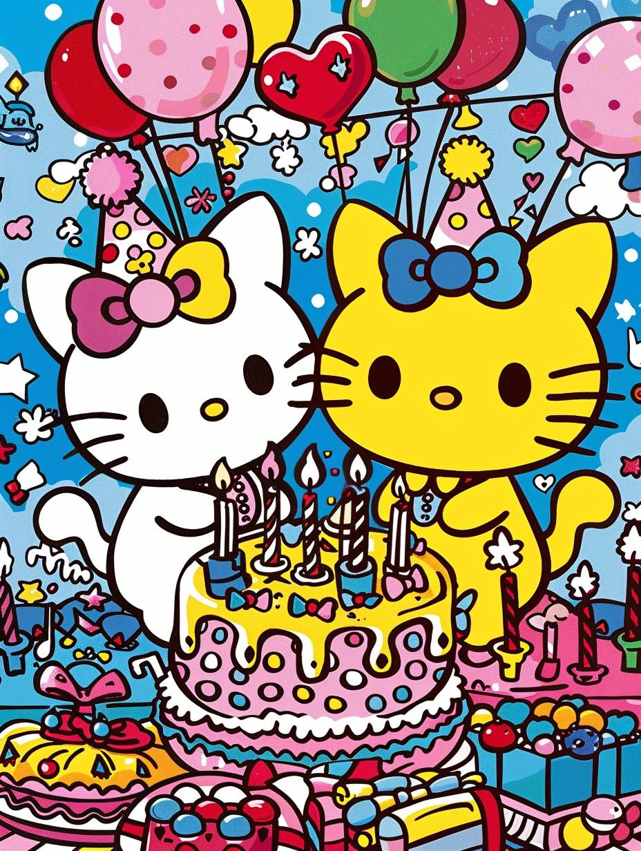 Uma cena com Hello Kitty e Mimi comemorando seu aniversário