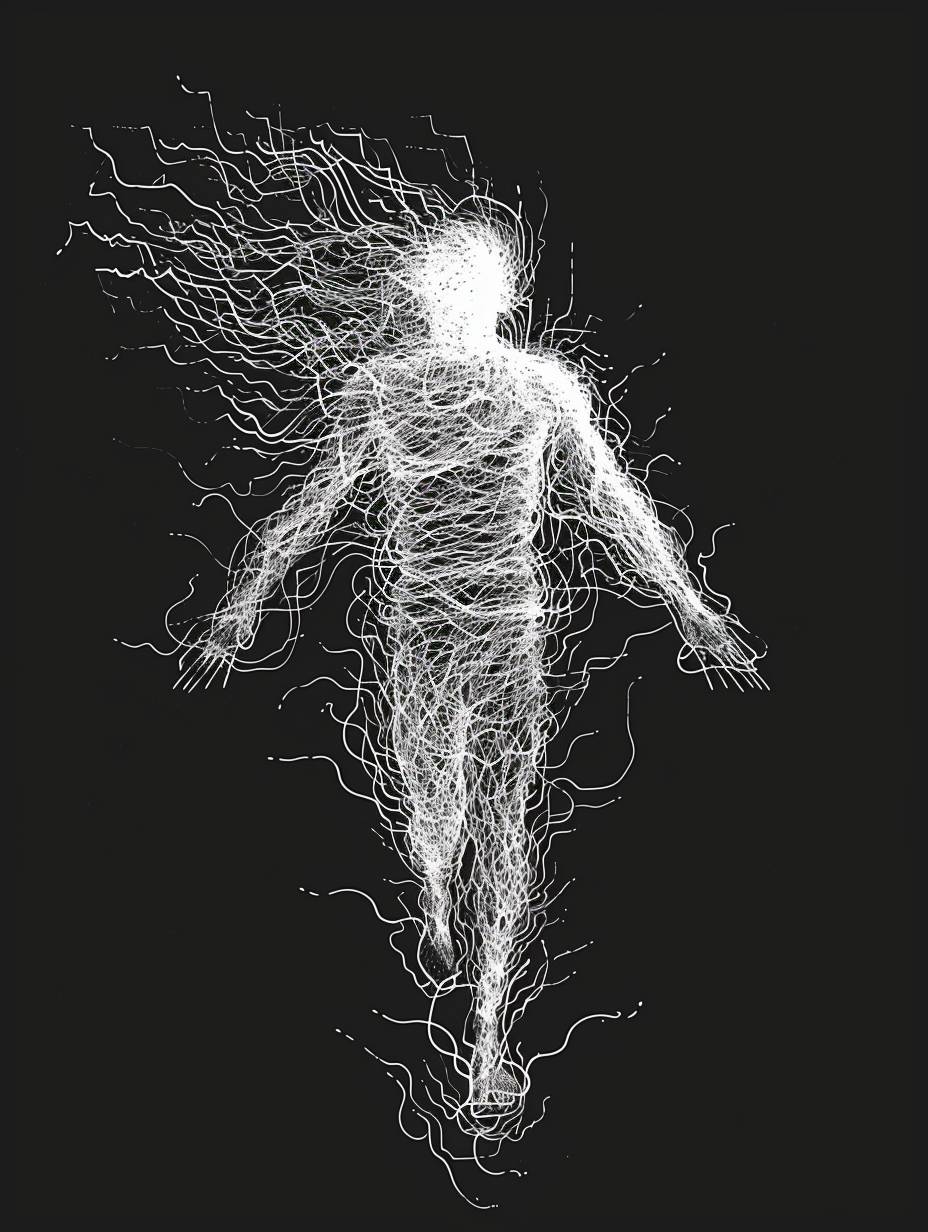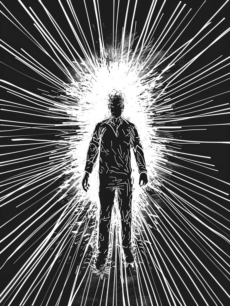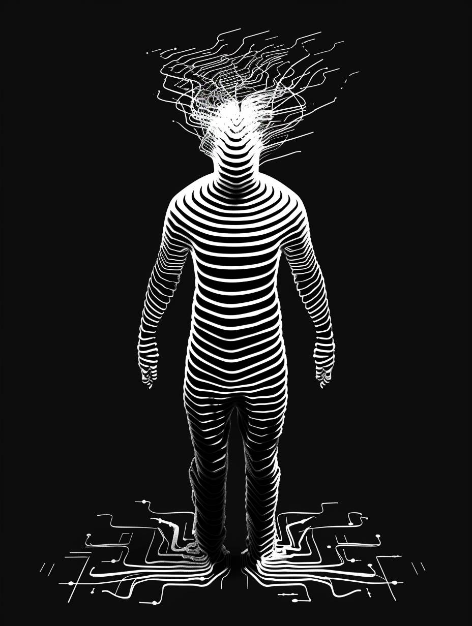 Arte de vanguarda, para Joy Division + [uma vista frontal de uma silhueta de corpo inteiro se expandindo do centro para fora da moldura. com um centro oco, apenas arte de traço [lineart], expandindo em mais traços de frequências explosivas.] apenas linhas, 2D, OPart, plano, branco sobre preto.