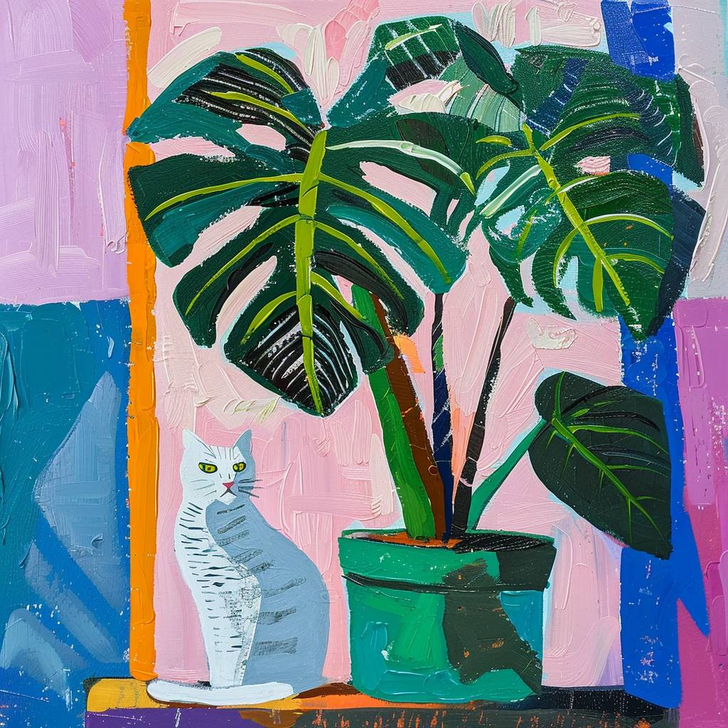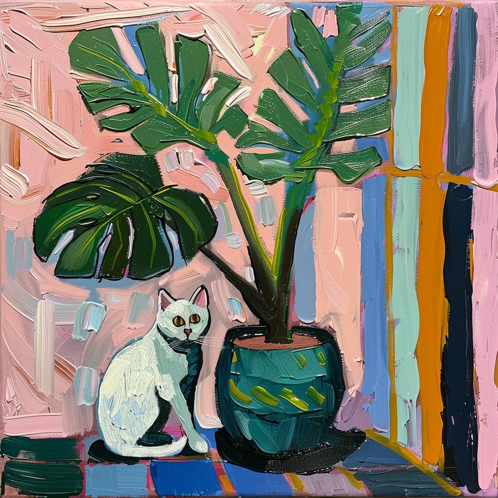 Uma pintura a óleo de uma planta monstera em um vaso verde com um gato branco ao lado.