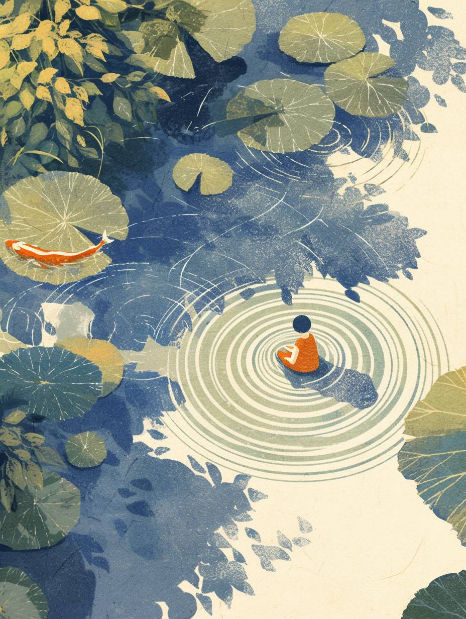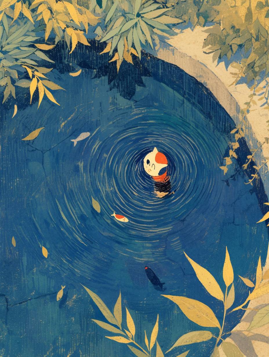 A children's illustration drawn with crayons, with a cute cat swimming in a river, complex linear colored lines, and linear ripples around it. The illustration is drawn in a flat style with colored lines, with green as the main color. The composition perspective is a bird's-eye view, looking down from the sky. 64K --ar 3:4 --s 1000 --niji 6