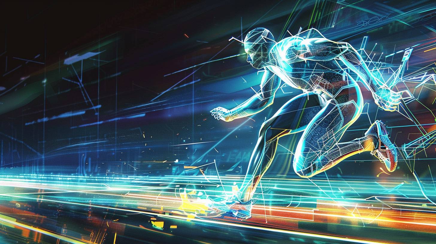 Uma representação futurista e dinâmica de um esporte olímpico, mostrando atletas em ação com um toque moderno e tecnológico. A imagem deve combinar elementos tradicionais do esporte com tecnologia futurista, destacando a evolução do desempenho atlético. Use visuais elegantes e de alta energia para capturar a intensidade e a inovação dos jogos.
