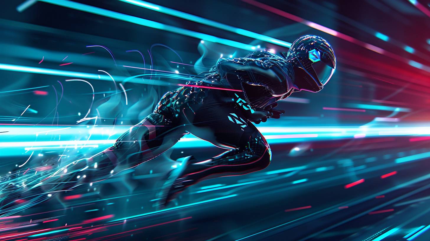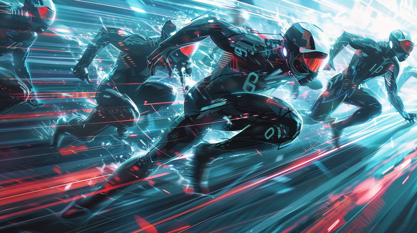 A futuristic and dynamic representation of an Olympic sport, showcasing athletes in action with a modern, high-tech twist. The image should blend traditional sports elements with futuristic technology, highlighting the evolution of athletic performance. Use sleek, high-energy visuals to capture the intensity and innovation of the games --v 6.0 --ar 16:9