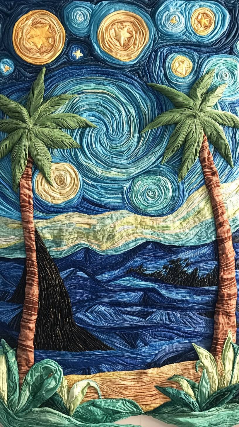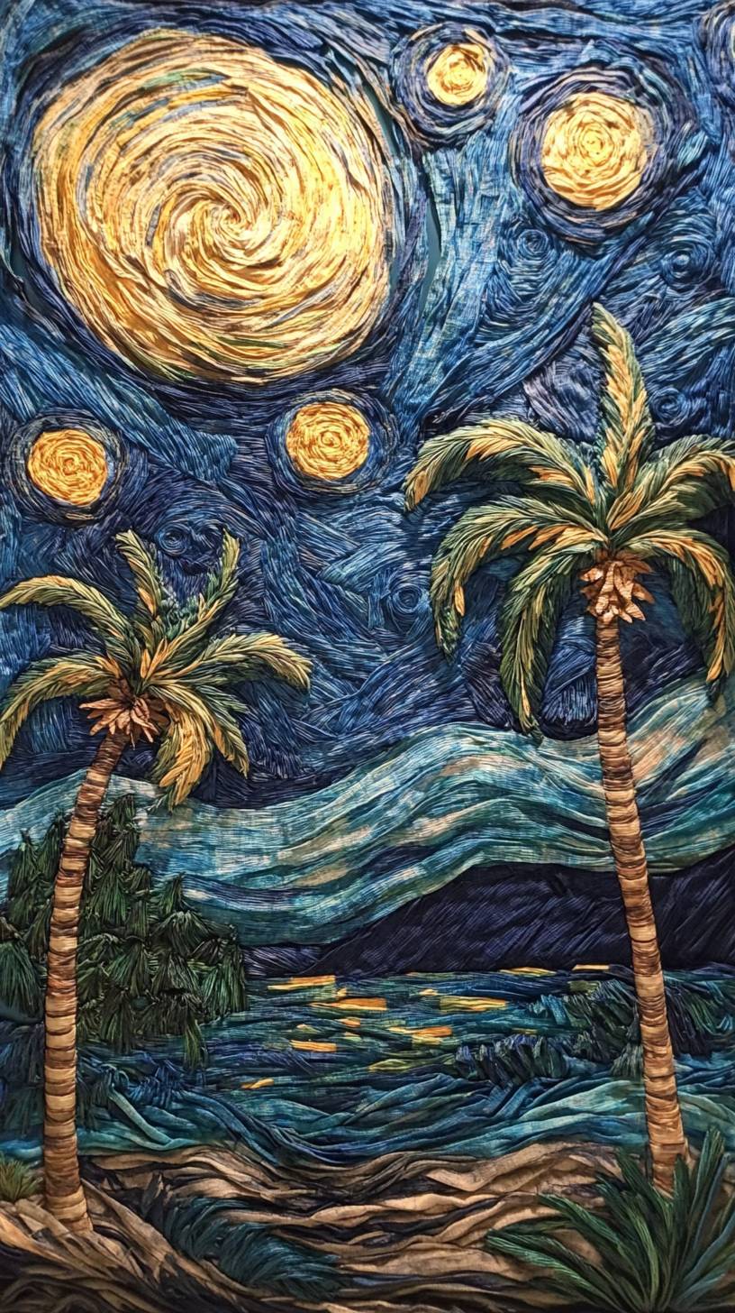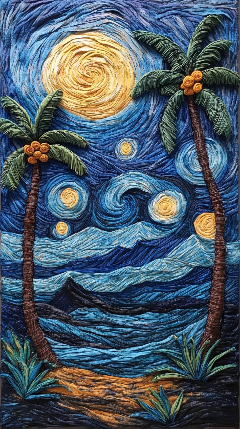 Recrie 'A Noite Estrelada' de Van Gogh com palmeiras em um estilo de arte de tecido esculpido.