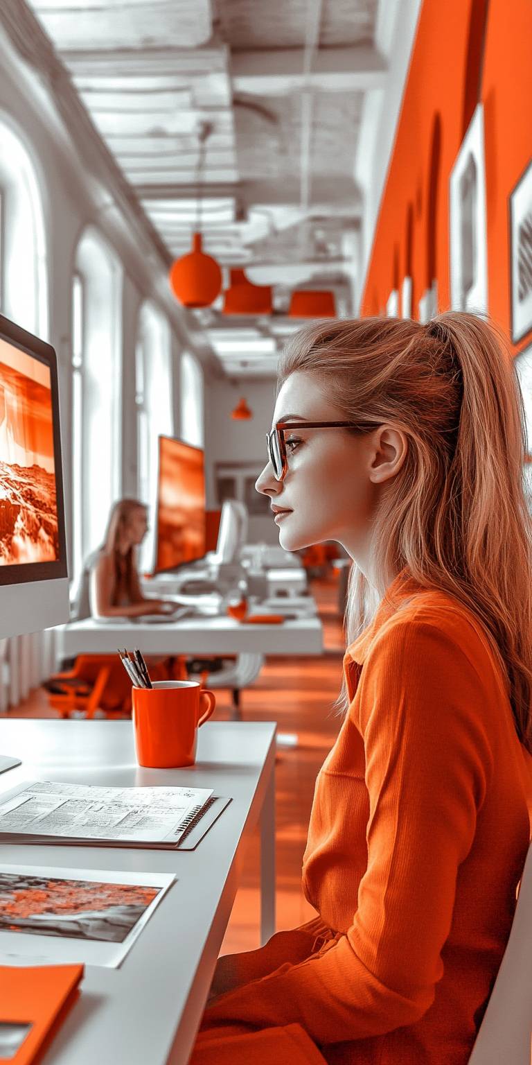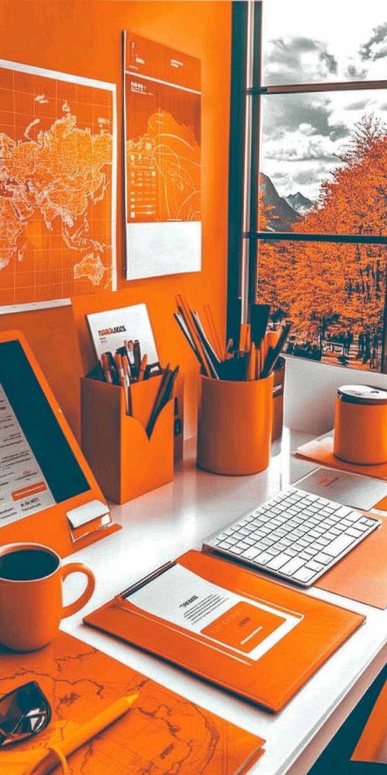 A bright and modern office designed for a travel agency, featuring a color scheme of white and vibrant orange. In the foreground, there is a close-up of a sleek white desk, adorned with a few orange accents such as a desk lamp, stationery holder, and a coffee mug. The desk is organized and inviting, with a computer, a world map, and a few travel brochures neatly arranged. In the background, the office has large windows letting in plenty of natural light, white walls, and additional orange decor elements, creating an energetic and welcoming atmosphere perfect for inspiring travel plans. --chaos 50 --ar 1:2 --style raw --stylize 0 --weird 900 --v 6.1