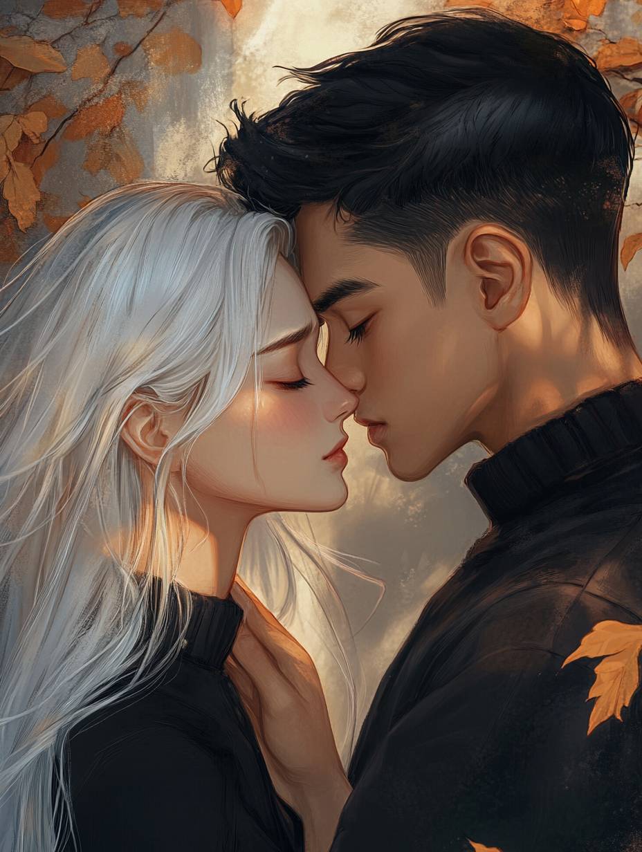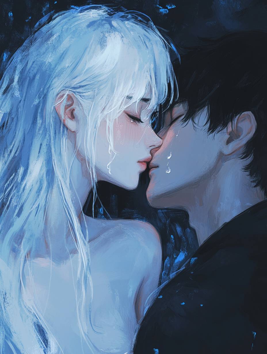 In the medium-sized cabin cabin designed in British style, a young woman with long silver-white hair turned her profile towards the camera. The young woman's eyes were wet with tears and she raised her hand to touch the sleeping cheek of a young man with short black side-parted straight hair. The young woman lowered her head Head kissing man's cheek, masterpiece, best quality, illustration, soot blue, cinematic lighting, refined facial features, detailed eyes, keen pupils, realistic pupils, depth of field, bokeh, sharp focus, (hyper detailed , bloom, shine) --ar 3:4 --v 6.1