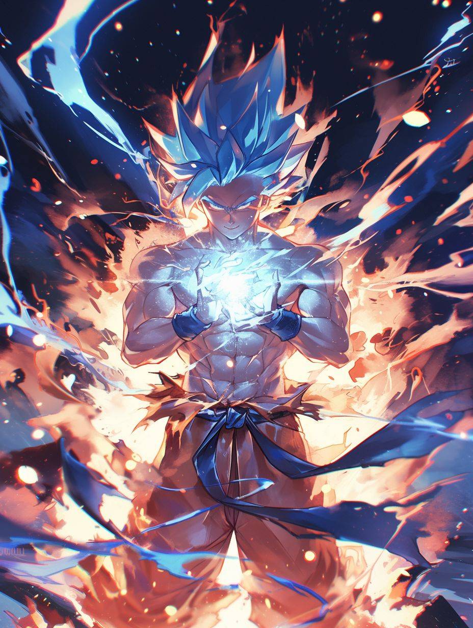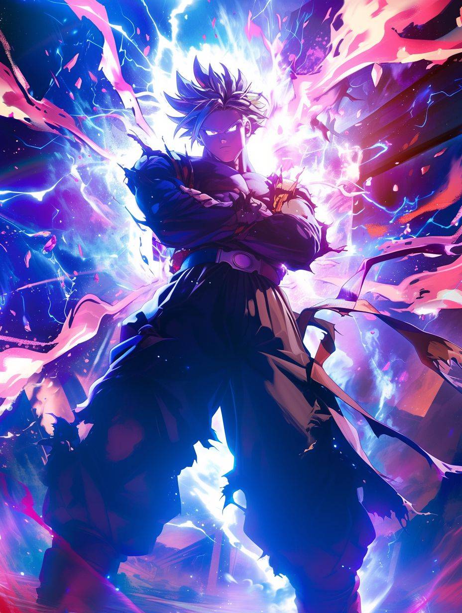 Seu personagem, em sua pose icônica, cercado por uma aura calma e poderosa, no estilo de anime clássico, estilo de arte digital com cores vibrantes, detalhes em alta definição, postura poderosa.