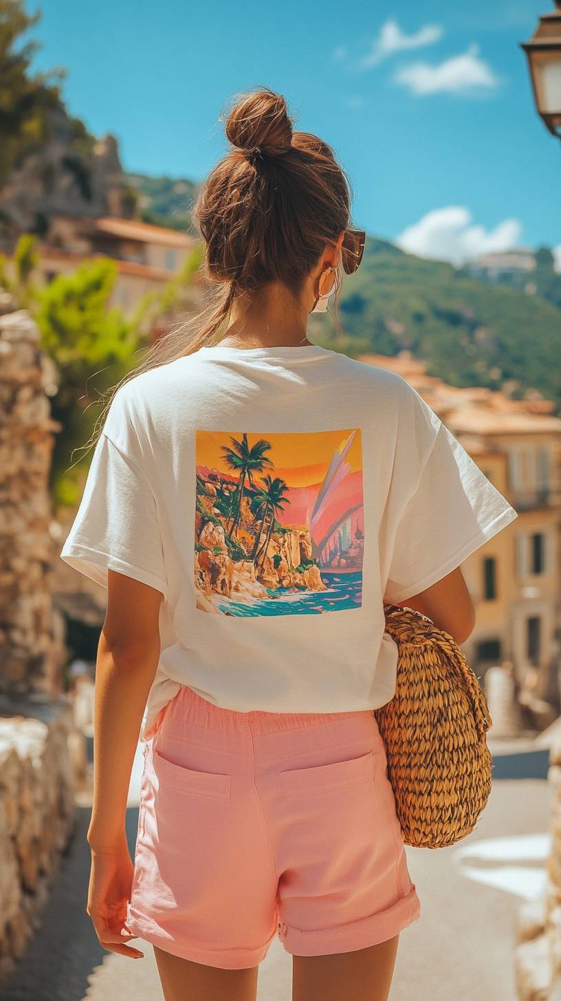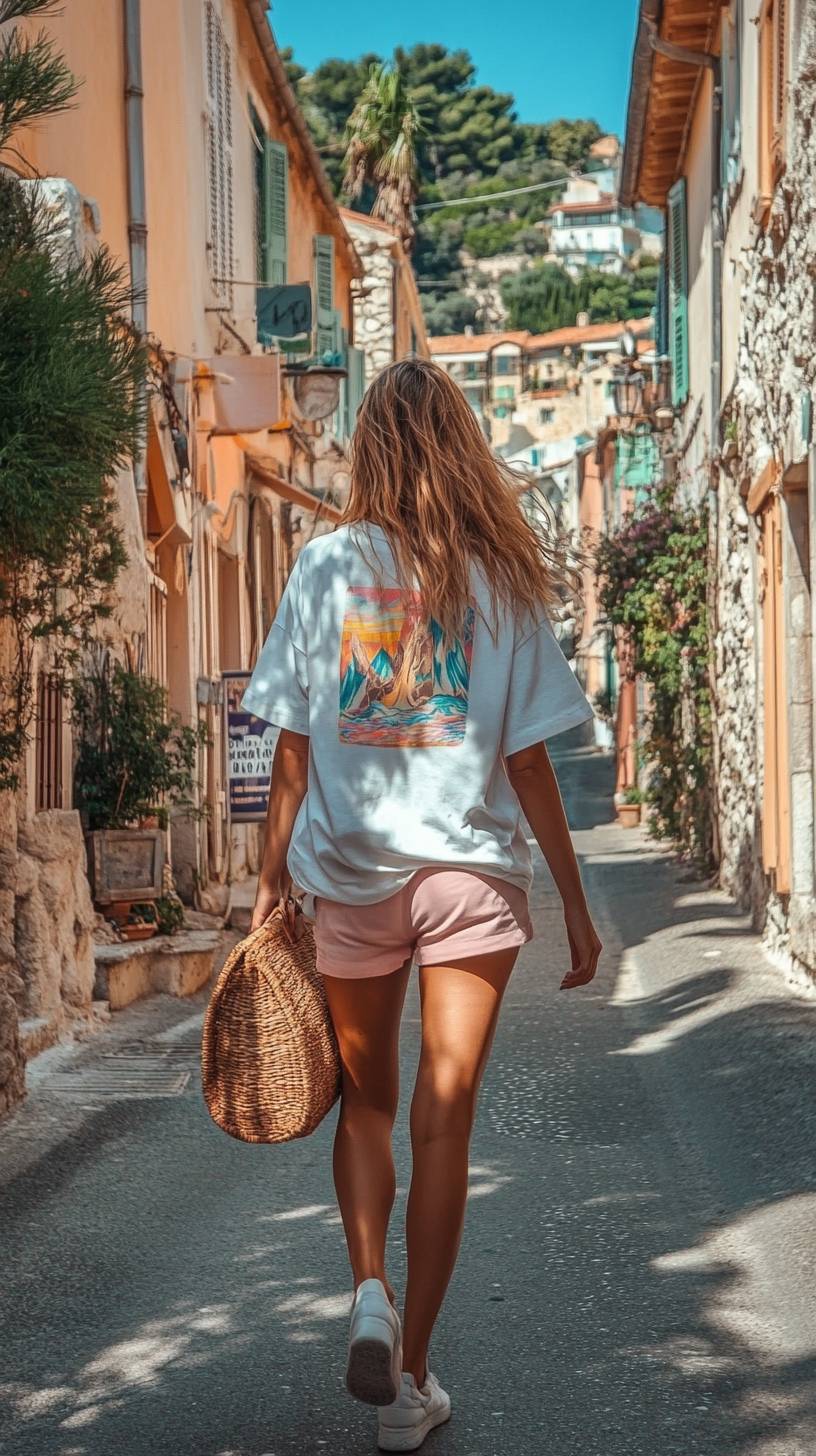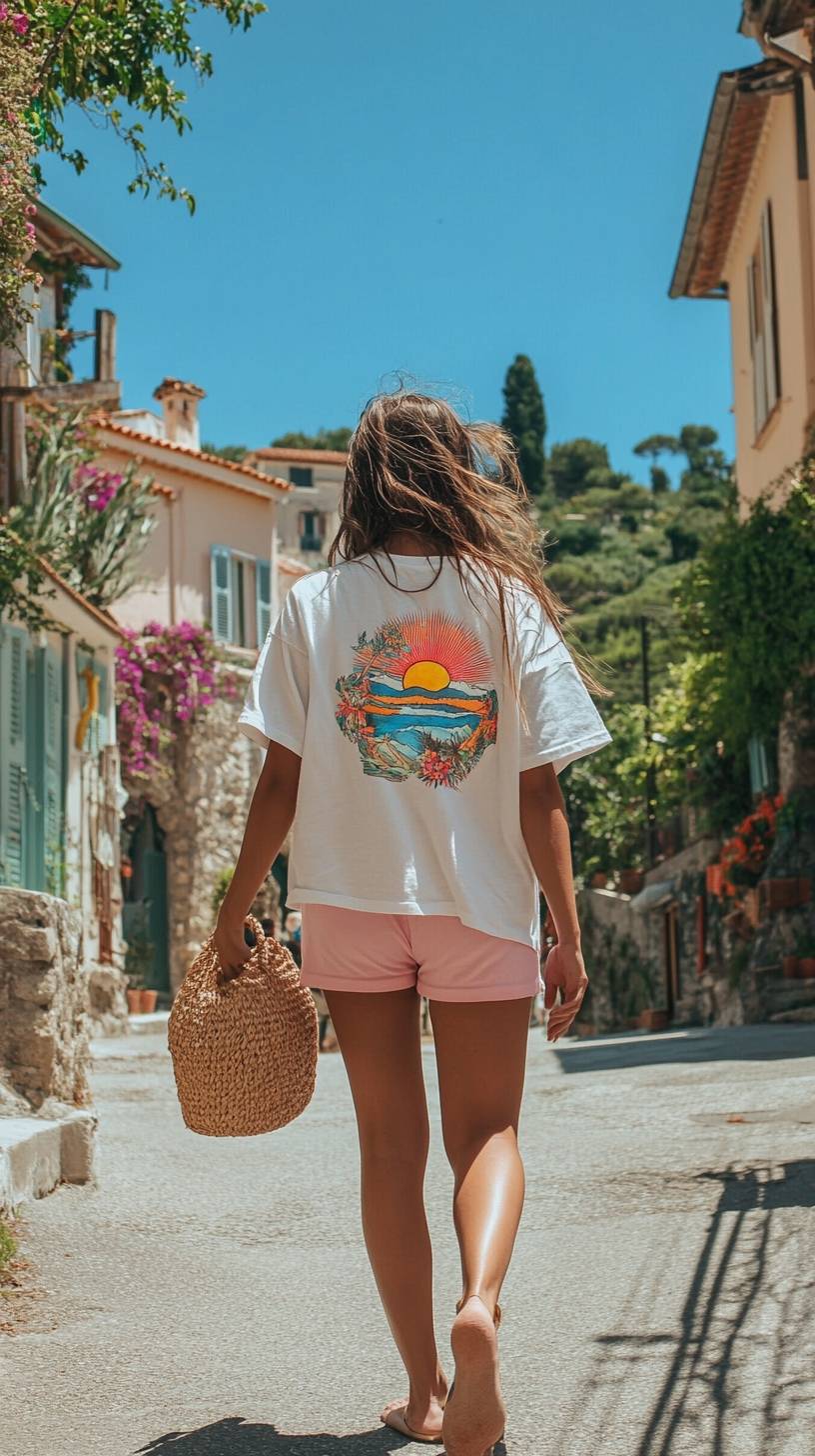 Photo of an Instagram model wearing an oversized white t-shirt with a colorful surf design on the back, pink shorts and a straw bag walking in a French Riviera village. A full body shot. --ar 9:16 --v 6.1