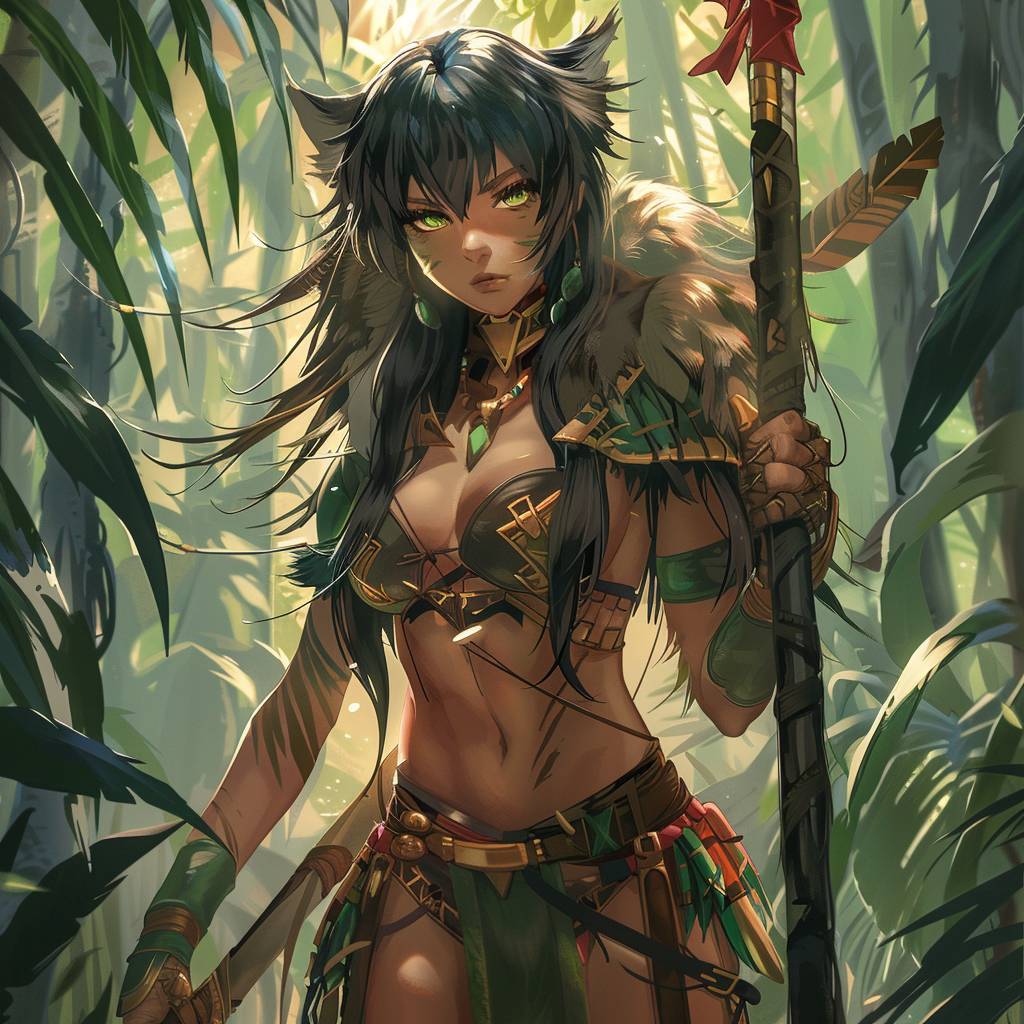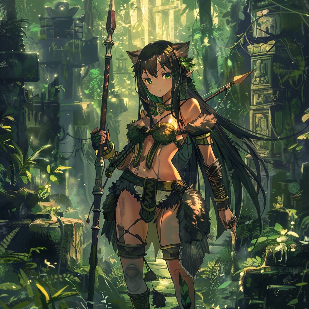 Beautiful anime warrior girl, wearing an Amazonian battle outfit with animal pelts and a spear, with long black hair and fierce green eyes, standing heroically in a dense jungle with ancient ruins, in the style of anime art with vibrant colors, high resolution, intricate details, soft lighting, and a wild atmosphere, warm tone and lighting --v 6.0