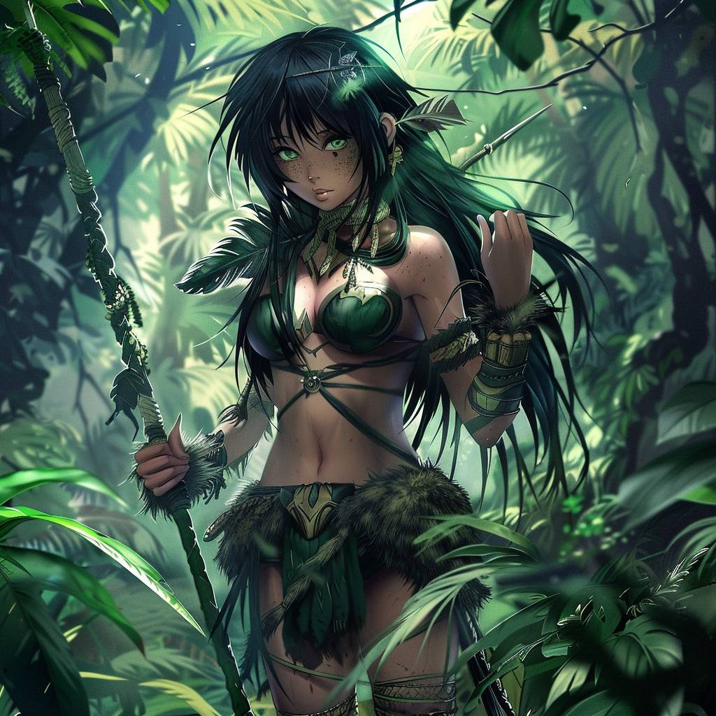 Bela garota guerreira de anime, vestindo uma roupa de batalha amazônica com peles de animais e uma lança, com longos cabelos negros e olhos verdes ferozes, de pé heroicamente em uma densa selva com ruínas antigas, no estilo de arte de anime com cores vibrantes, alta resolução, detalhes intrincados, iluminação suave e uma atmosfera selvagem, tom e iluminação quentes.