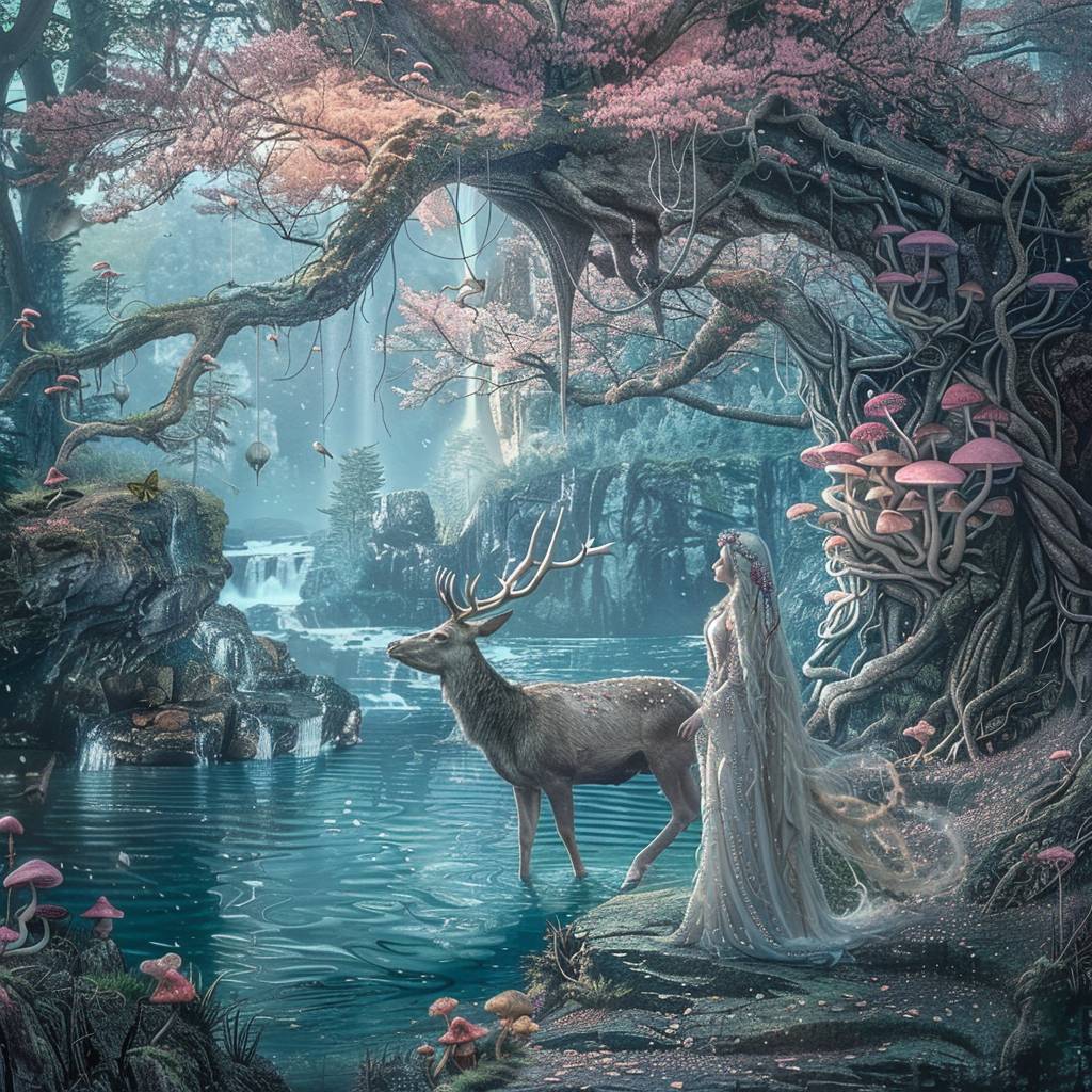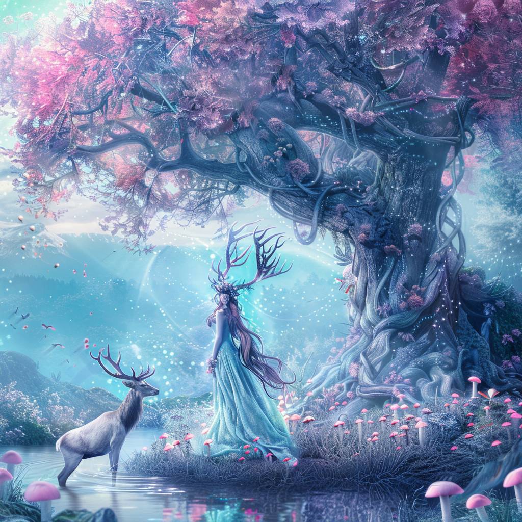 A beautiful goddess with long flowing hair standing with her majestic stag under a tree with intricate branches overtaken by pink mushrooms, by the aqua ble lake --v 6.0