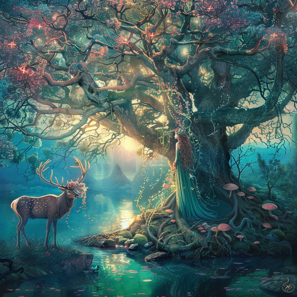 Uma bela deusa com longos cabelos soltos, de pé ao lado de seu majestoso veado sob uma árvore com ramos intrincados cobertos de cogumelos rosa, perto do lago azul aquoso.