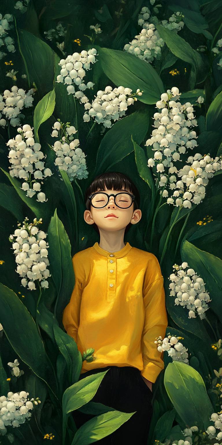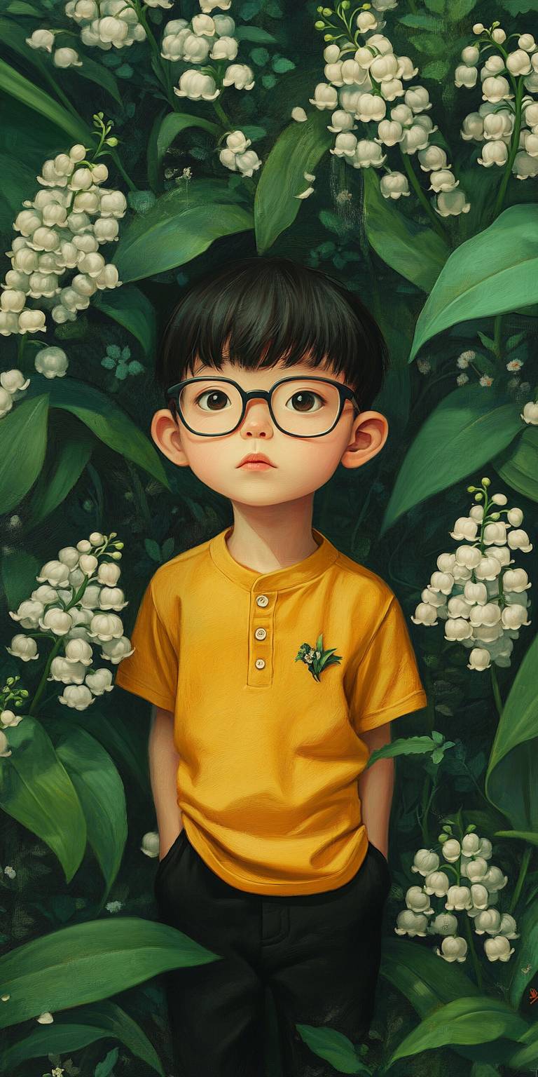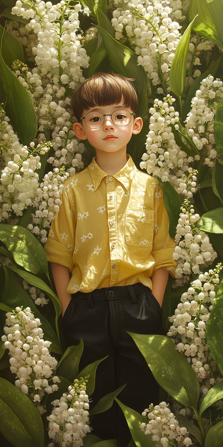 Elly Kerwick kiplines artist style, a Little young asian boy in yellow shirt and black pants with glasses hypersensibles et haut potentiel intellectuel, image réaliste, belles couleurs, fantasy, whimsical, giant white lili of the valley flowers and green leaves niji5 --ar 1:2 --v 6.1