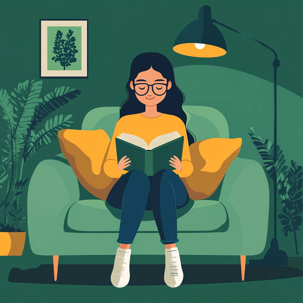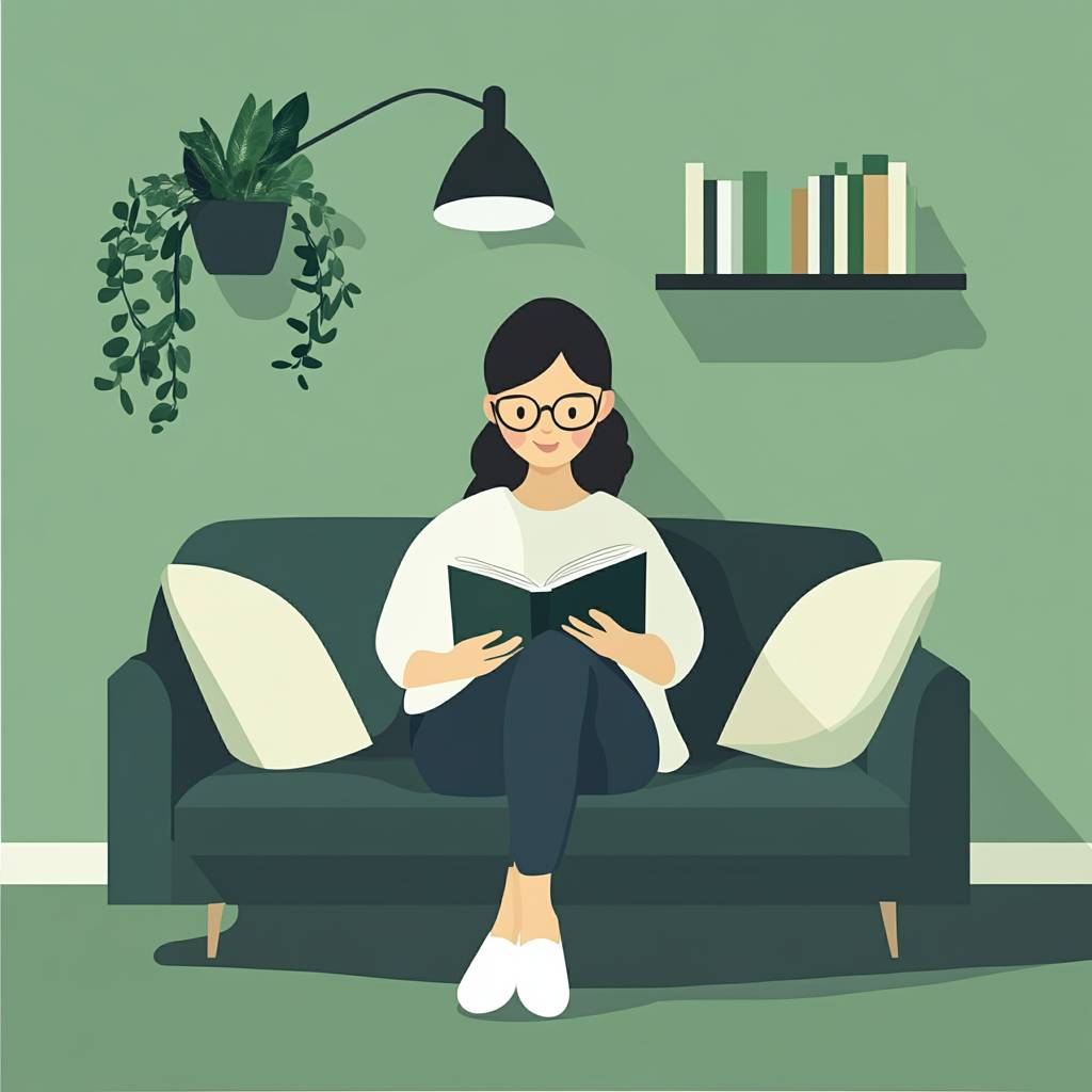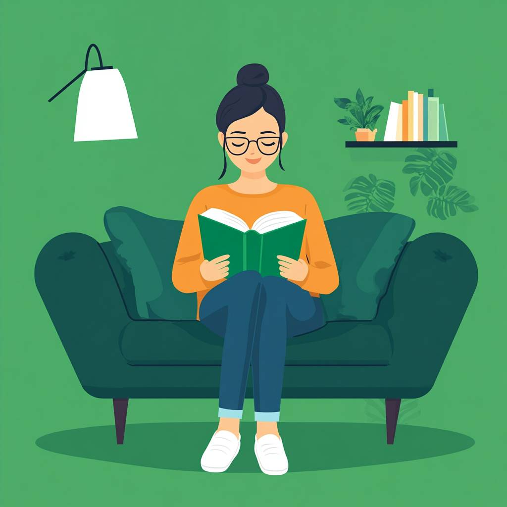 Woman sitting on the sofa reading, flat design illustration with vector graphics and solid colors, simple background with a green color scheme, flat style illustrations, clean and fresh environment, high resolution, no shadows, 2D cartoon characters, character details. The woman is wearing glasses and jeans, holding an open book in her hands, surrounded by soft lighting. A cozy living room setting adds to its ambiance. The style of the illustration is in the style of . --style raw --v 6.1