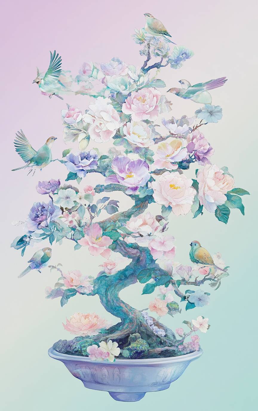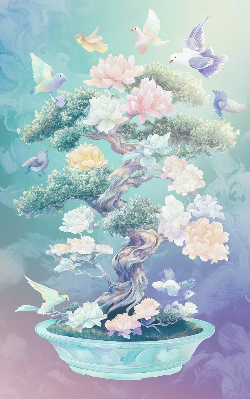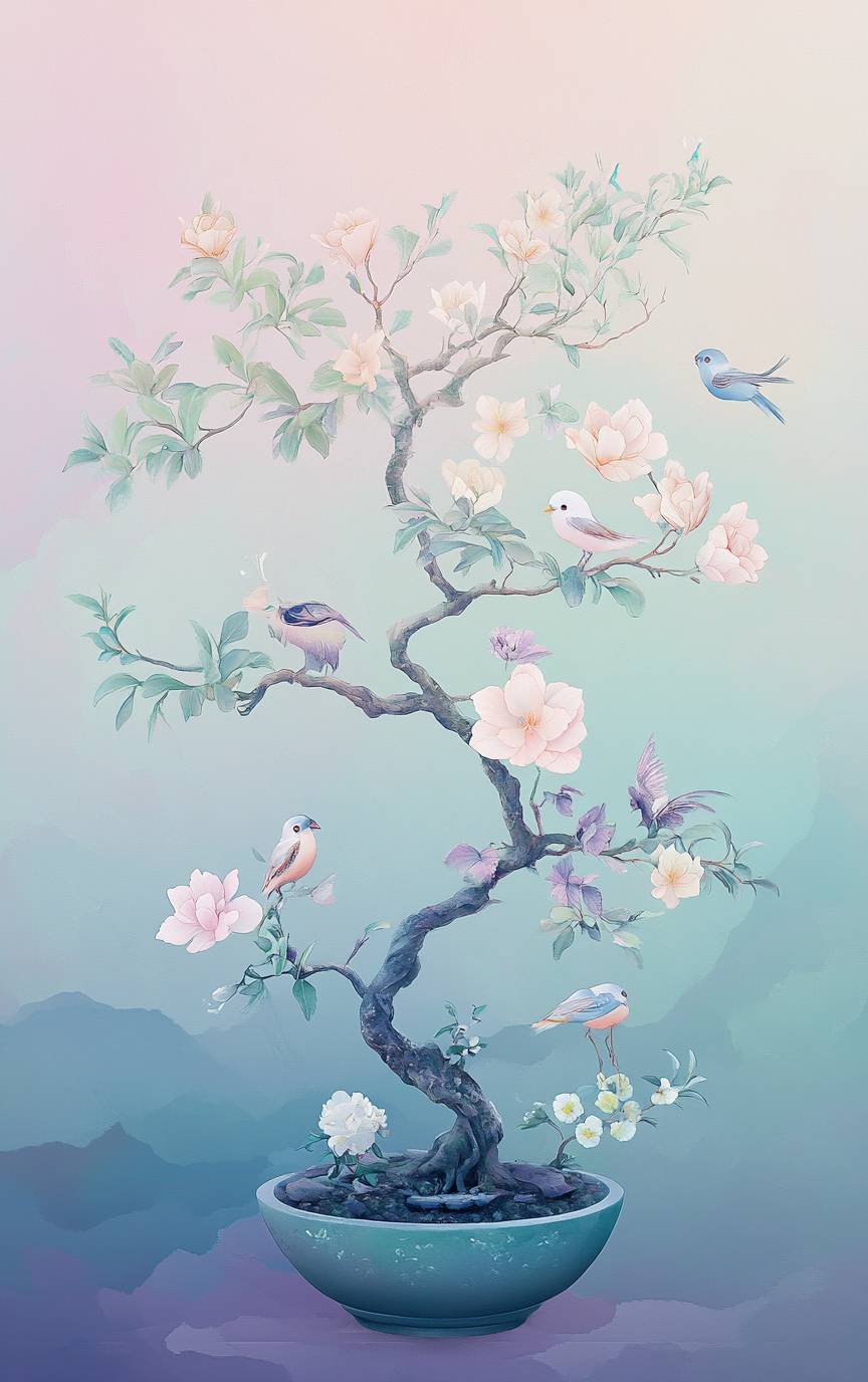 ,A painting of an illustration with pastel colors, in the style of Hsiao Ron Cheng. A bonsai tree in the shape of various flowers and birds. The background is a gradient of blue, purple, and green. Full body shot. --ar 5:8 --style raw --stylize 50 --v 6.1