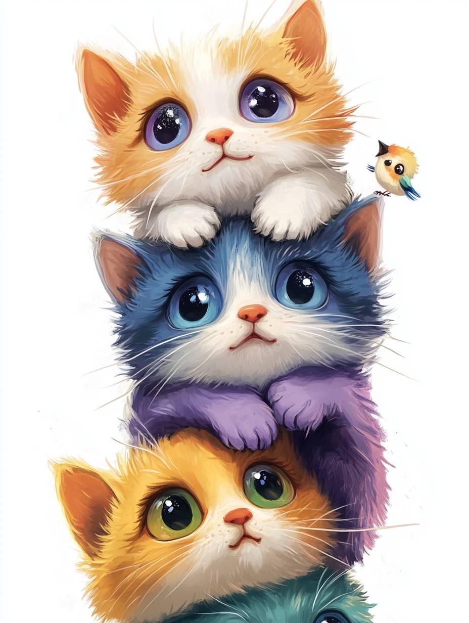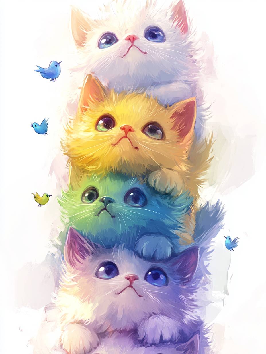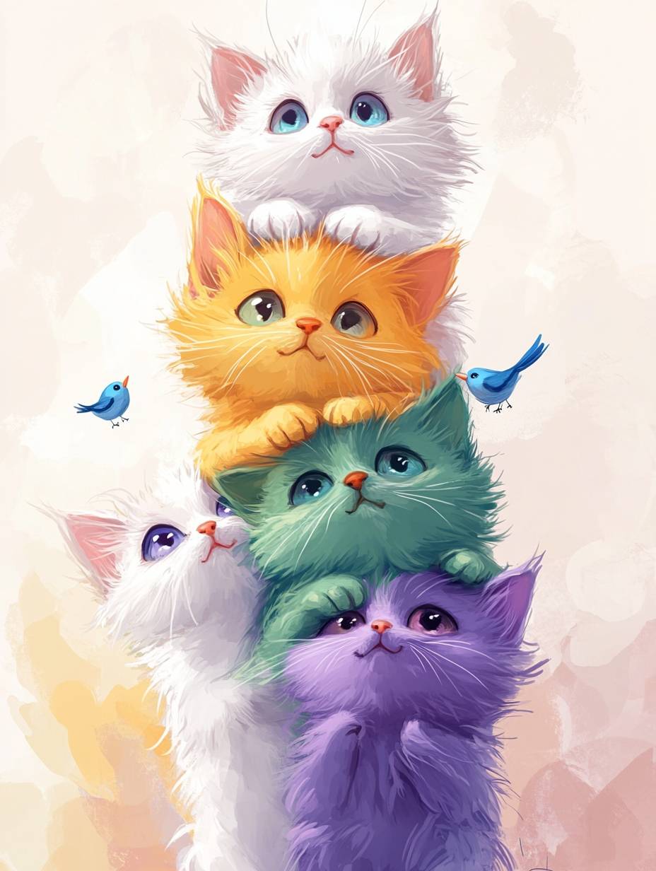 Five different white, yellow, blue, purple and green kittens, with different exaggerated expressions stacked together, looking up, little birds, childish and warm, style cartoon, illustration, cute, healing --ar 3:4 --stylize 150 --v 6.1