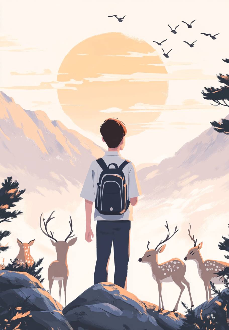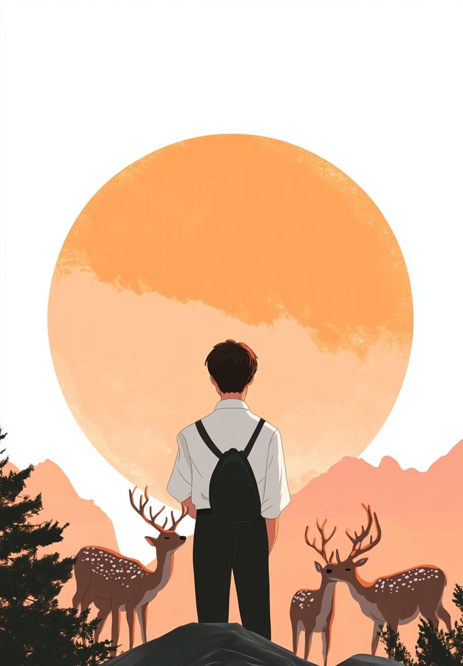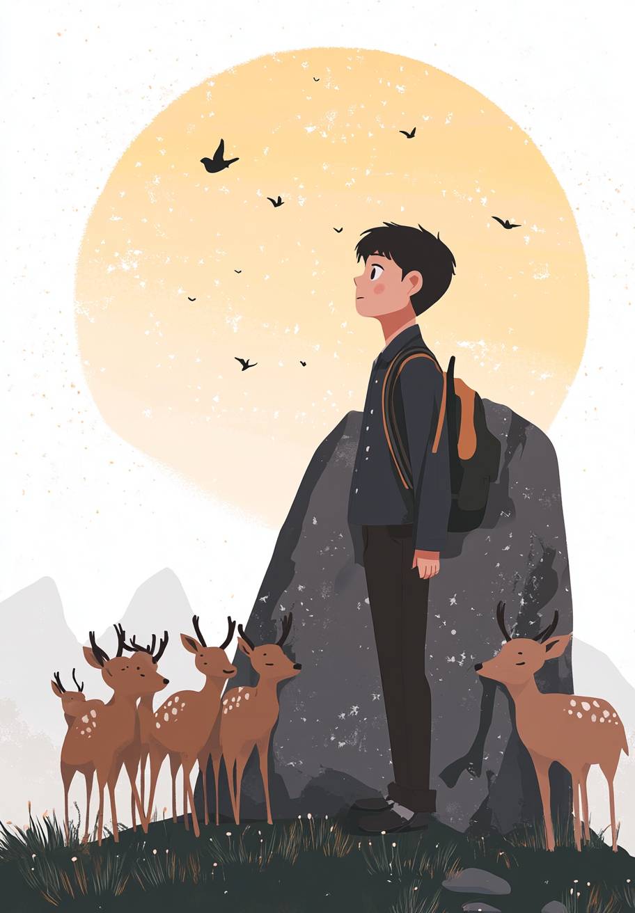 Super attractive An incredibly boy, A large stone in Seosan at sunset, an incredibly handsome and tall male student in a Korean school uniform crying while looking at the sky, a herd of deer next to him crying sadly together, beautiful mountain scenery, high clear sky., The white background is neat,vector illustrations, simple shapes and lines, colorful, flat style, cute patterns with white background.fairy tale style, famous painting-like white blackground,by Gemma Correll --ar 25:36 --v 6.1