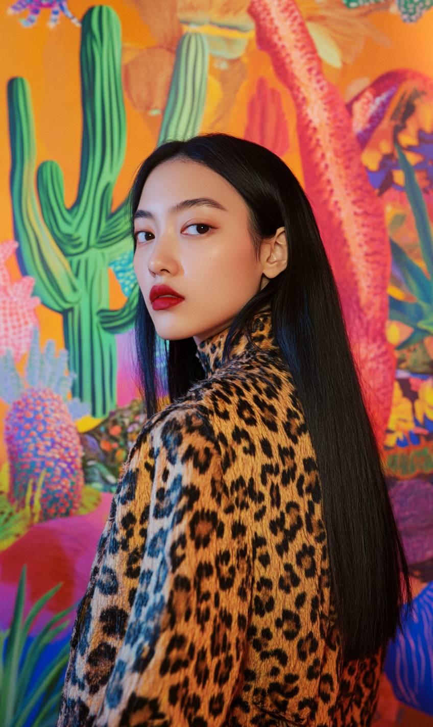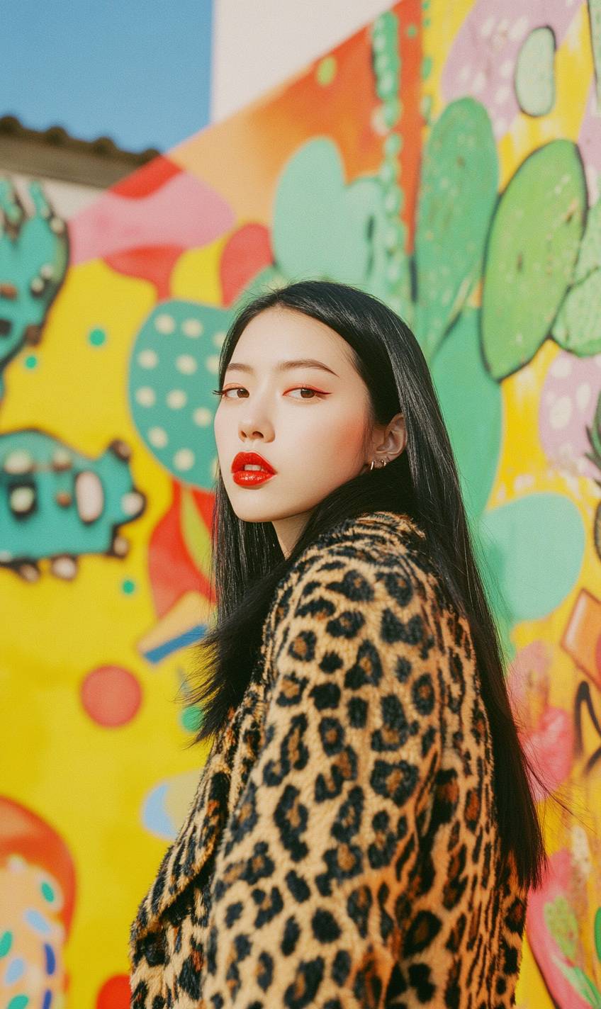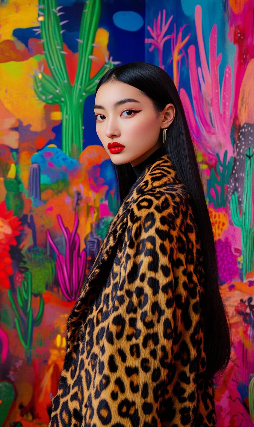 [High-resolution editorial fashion photography, with a vibrant, artistic aesthetic], [a young Asian female model with long, sleek black hair, wearing a striking leopard-print coat], [the outfit features bold animal prints that contrast with the colourful background], [the scene is set against a vivid and surreal mural of a desert landscape, filled with brightly coloured cacti, trees, and abstract shapes, all in neon and pastel hues], [bright, saturated lighting with a lively and playful mood, highlighting the model’s bold red lipstick and the vivid colours around her], [the model is standing slightly to the side, gazing confidently at the camera, adding to the dynamic composition], [shot on Kodak Portra 400], [vibrant neon, bold primary colours, and earthy animal print palette]--v 6.1 --ar 3:5