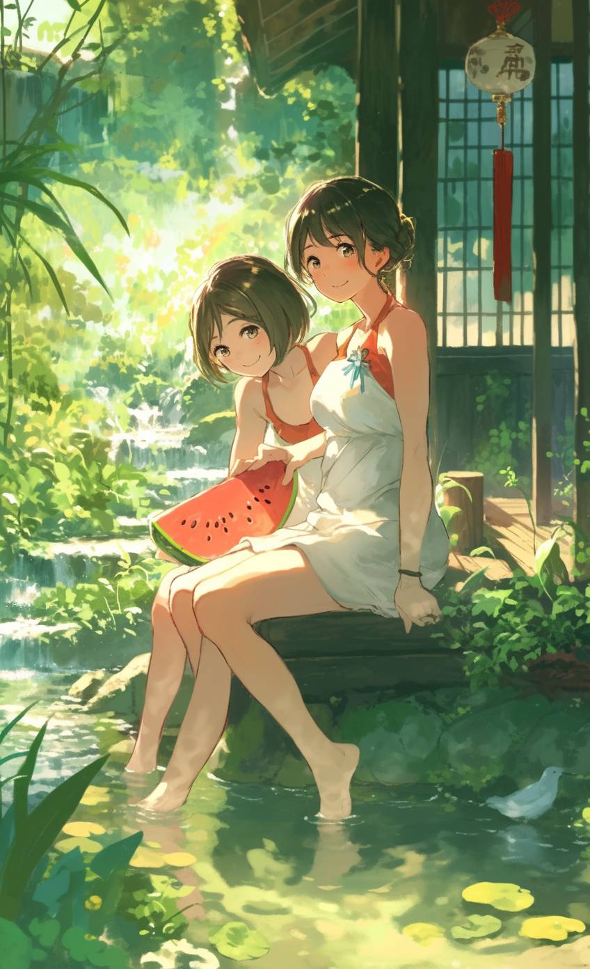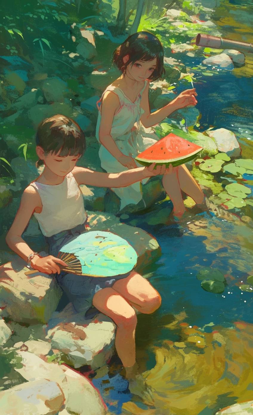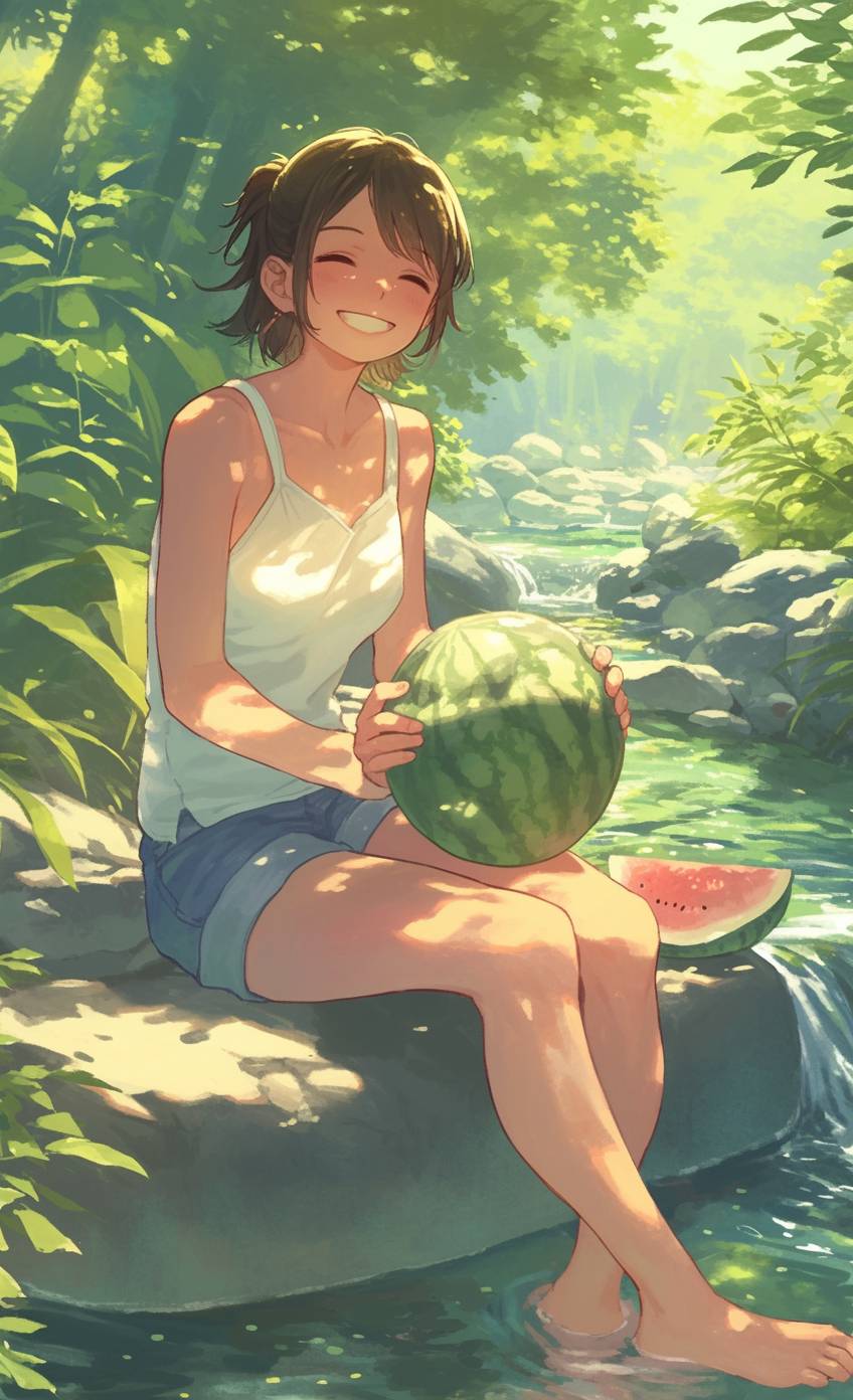 Photo of beautiful Japanese women holding a large fan in one hand and a watermelon in the other, sitting by a stream. They are wearing a white tank top, have short hair, and are barefoot, with a smile on their faces. --ar 39:64 --niji 6