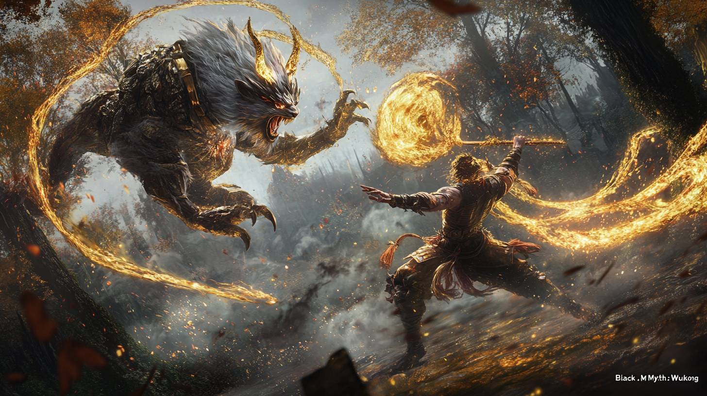 An epic battle scene from "Black Myth: Wukong", where Sun Wukong clashes with the first boss, the fearsome Tiger Demon. Wukong is mid-air, wielding his golden staff with lightning speed, while the Tiger Demon roars, its massive claws slashing through the air. The background is a dark and ancient forest, with towering trees and swirling mist. The atmosphere is intense, with sparks flying, dust rising from the ground, and both combatants radiating powerful energy. Dramatic lighting highlights the fierce expressions and dynamic movement in this high-stakes battle. --ar 16:9 --v 6.1