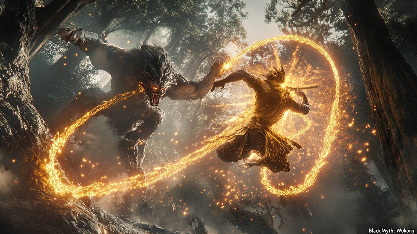 Uma cena épica de batalha de 'Black Myth: Wukong', onde Sun Wukong se enfrenta ao primeiro chefe, o temível Demônio Tigre. Wukong está no meio do ar, brandindo seu bastão dourado com velocidade relâmpago, enquanto o Demônio Tigre ruge, suas garras massivas cortando o ar. O fundo é uma floresta escura e antiga, com árvores imensas e neblina giratória. A atmosfera é intensa, com faíscas voando, poeira subindo do chão e ambos os combatentes irradiando energia poderosa. A iluminação dramática destaca as expressões ferozes e o movimento dinâmico nesta batalha de alto risco.