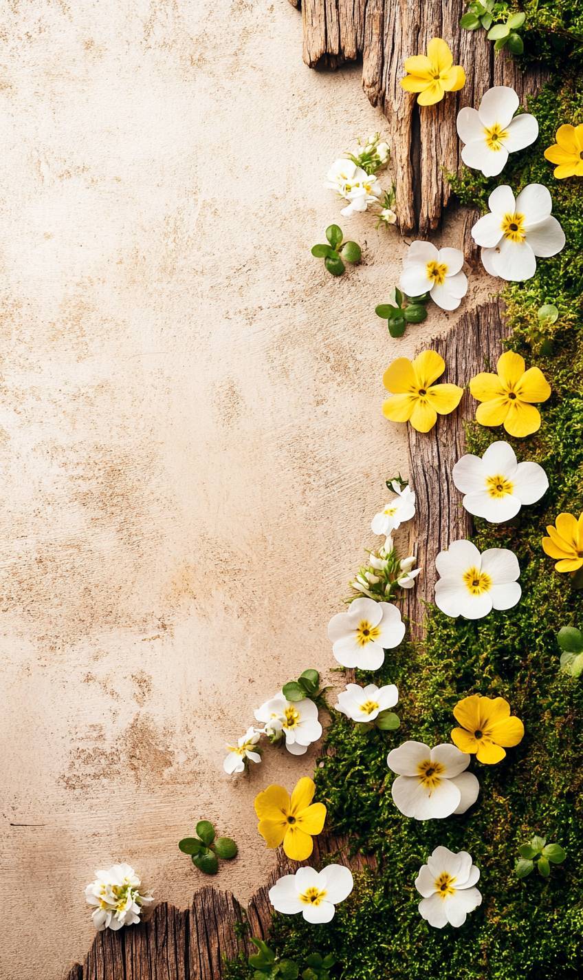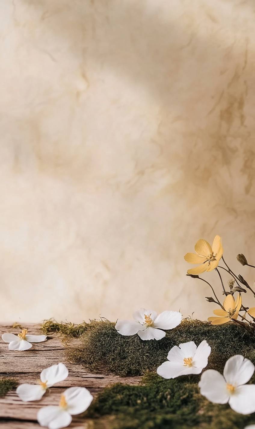 Um fundo minimalista com musgo e flores amarelas, pétalas brancas no lado direito da composição, madeira em primeiro plano e uma cor bege.