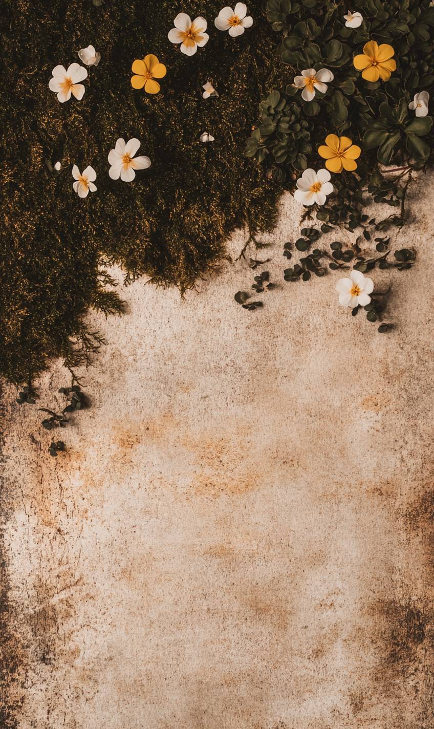 A minimalist background with moss and yellow flowers, white petals on the right side of the composition, wood in the foreground, and a beige color. --ar 3:5 --v 6.1