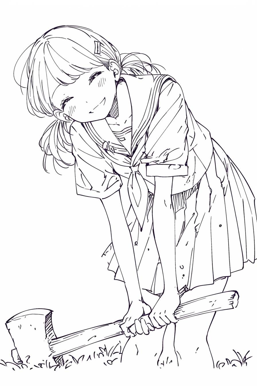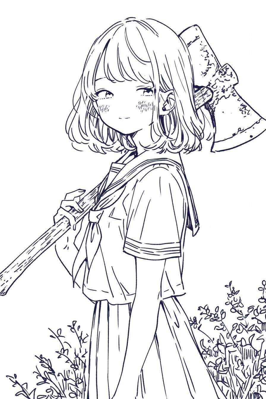 Uma garota levantando um machado, sorrindo. Jillian Tamaki. Uniformes para meninas do ensino médio japonês.