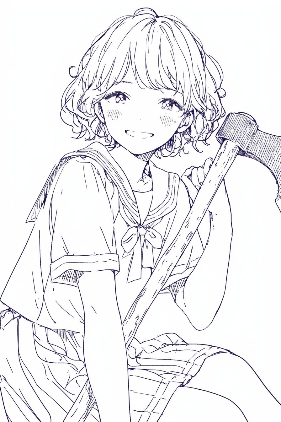 A girl raising an ax. smile. jillian tamaki. Uniforms for Japanese high school girls --sref 4270727113 --niji 6 --ar 2:3