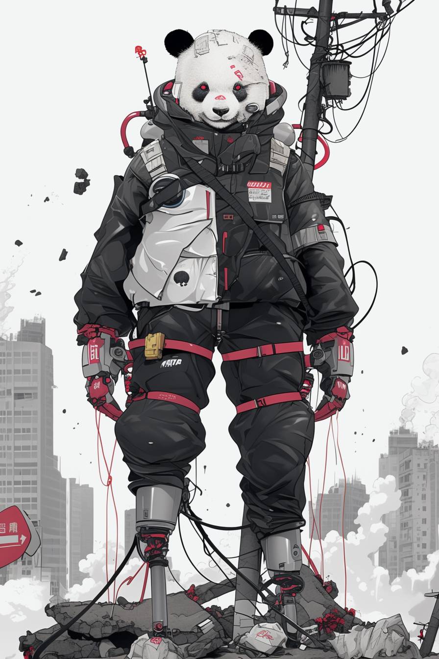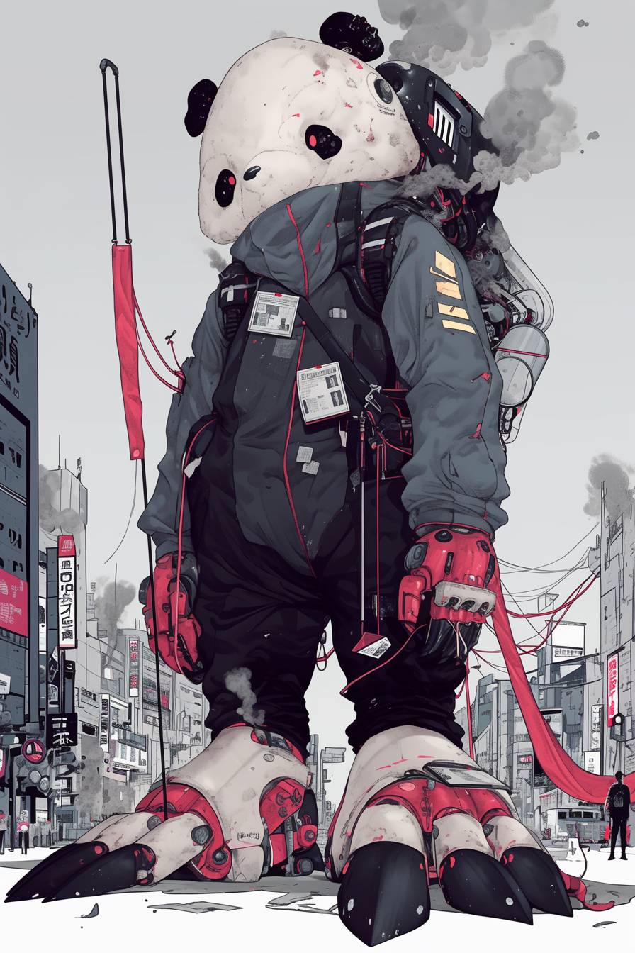 dystopian manga style, biohazard mascot, towering panda figure in protective gear, oversized helmet, robotic limbs, surrounded by urban decay and warning signs, post-apocalyptic metropolis, full-body portrait with busy surroundings, crumbling skyscrapers and smoke in background, intricate suit details and gadgets in foreground, dramatic side-lighting with yellow and white accents lighting, vibrant yellow and grayscale color palette, --ar 2:3 --style raw --sref 2107114802 --niji 6