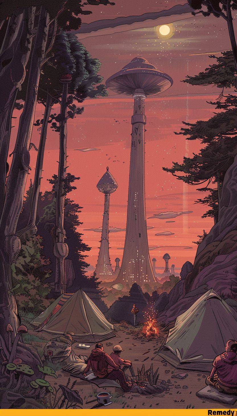 a poster in the style of the artist Jean Giraud (Moebius), for a science fiction novel called "Cosmic Remedy", displaying a mushroom camping scene during sunset with tents and people around a campfire, mushroomcore, futuristic mushroom tower can be seen in the distance, sci-fi adventure style, in the artistic style of artist Jean Giraud (Moebius) --ar 73:128